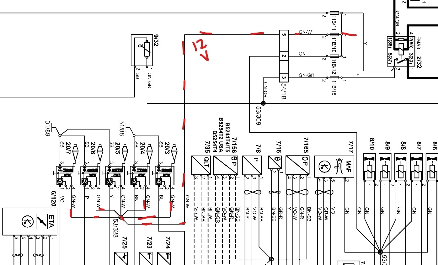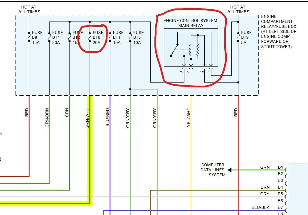 Okay, turn on the key and check at one of the green with white wires at any of the coils, is there power there? If yes then the mechanic was mistaken, if there is no power to those wires then you will need to trace that wire back to the fuse box as it's broken. Or if you want to see for sure, just connect a jumper wire between one of the green with white wires and battery positive. If it now starts you know it's in that wire between the splice and the fuse box. The diagram shows the power feed with red noting the path That is the green with white wire.