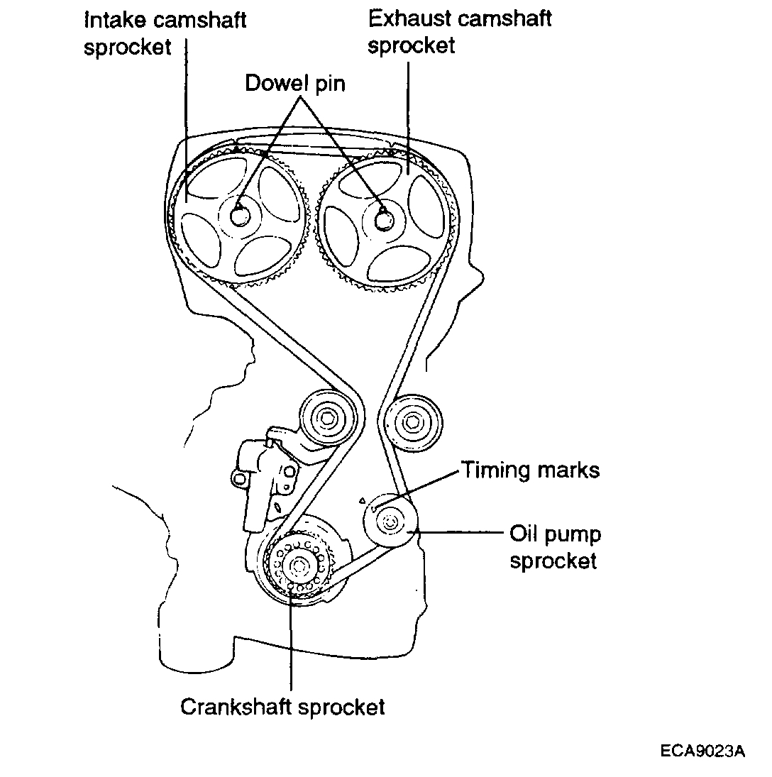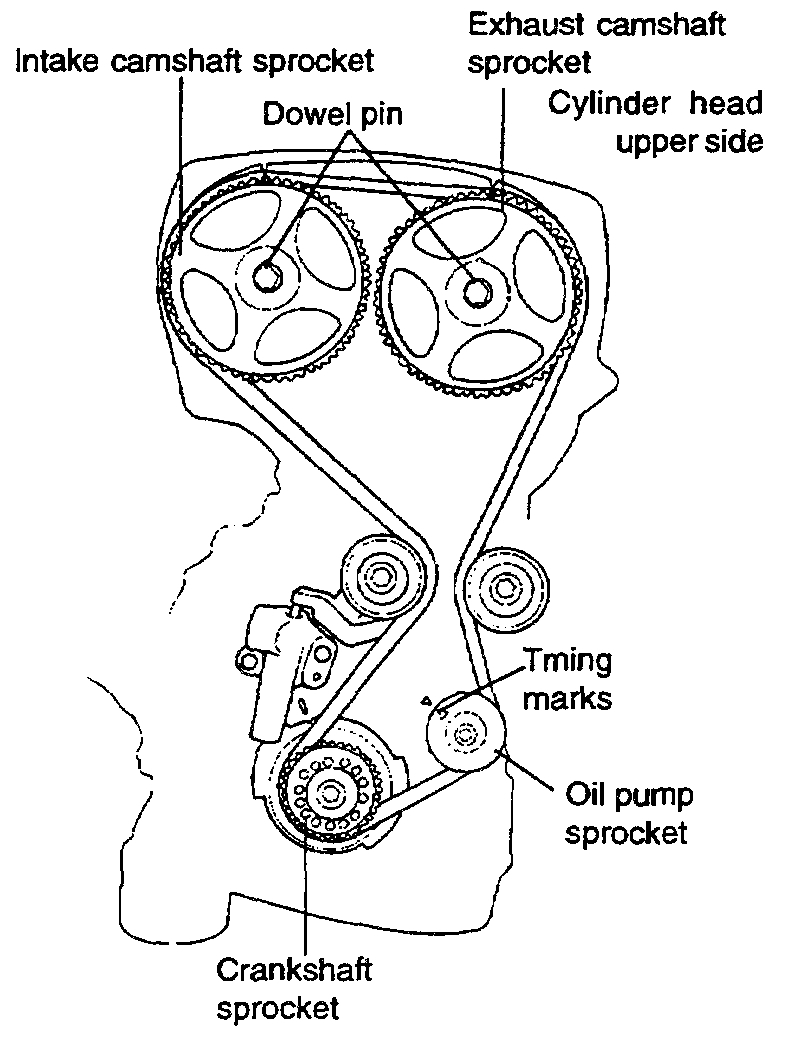 At this time the timing marks of the camshaft sprocket and the upper surface of the rocker cover should coincide, and the dowel pin of the camshaft sprocket should be at the upper side.