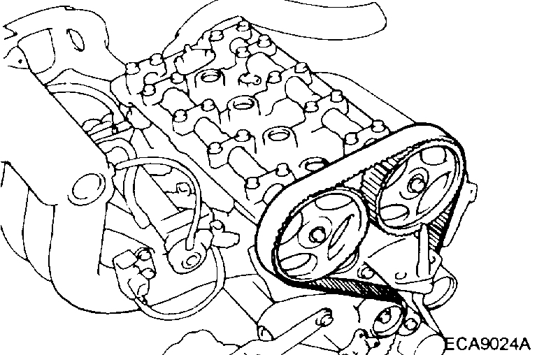NOTE: If the timing belt is reused, make an arrow mark indicating the turning direction (or the front of the engine) to make sure that the belt is reinstalled in the same direction as before.