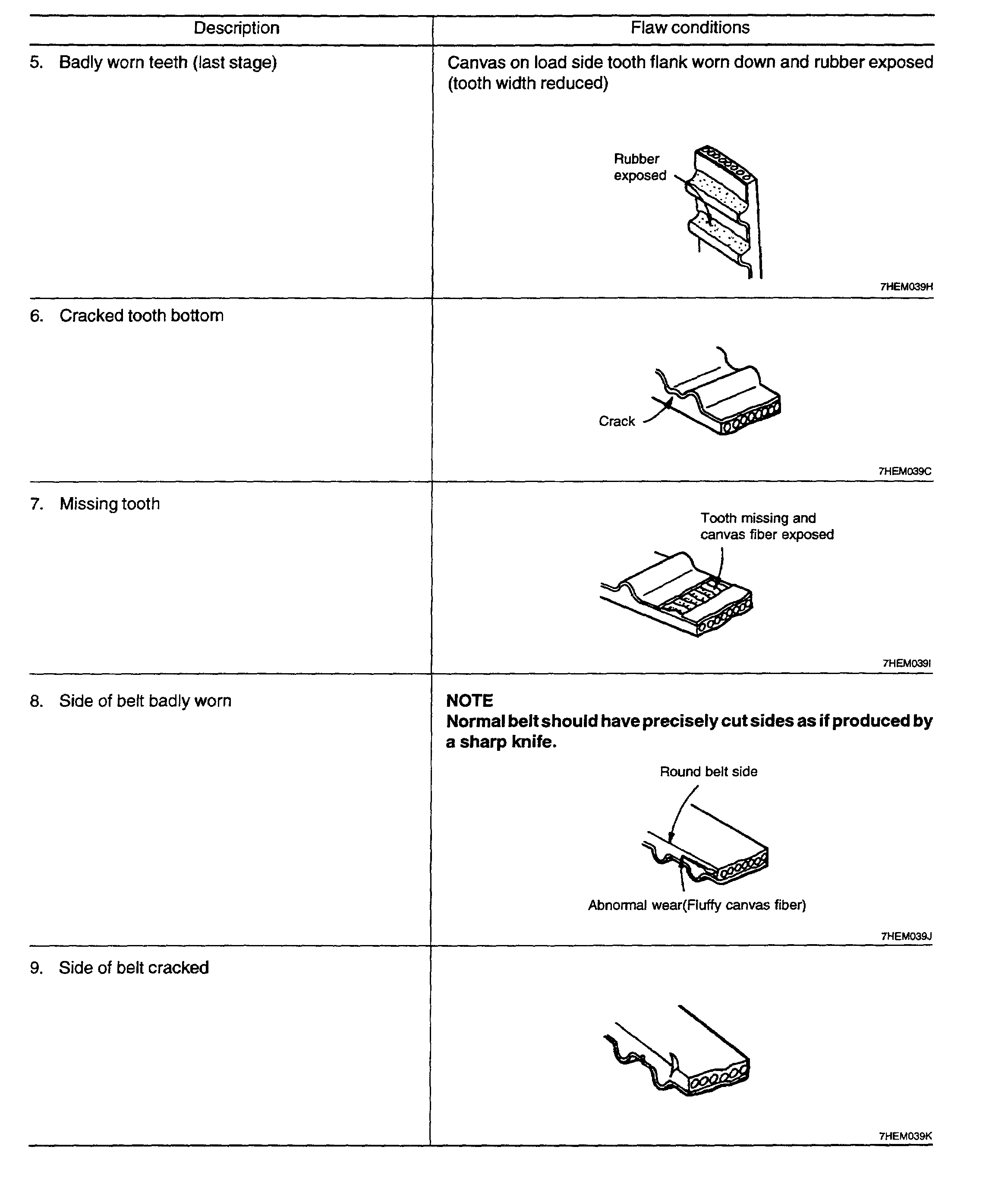 2. When the engine is overhauled or belt tension adjusted, check the belt in detail. If the following flaws are evident, replace the belt with a new one.
