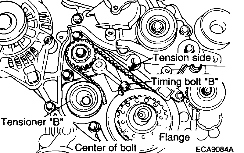 6. Lift tensioner "B" to tighten the timing belt "B" so that its tension side will be pulled tight. In this condition, tighten a bolt to secure tensioner "B". When a bolt is tightened, be careful to prevent from fuming together. If the shaft is turned together, the belt will be over tightened.