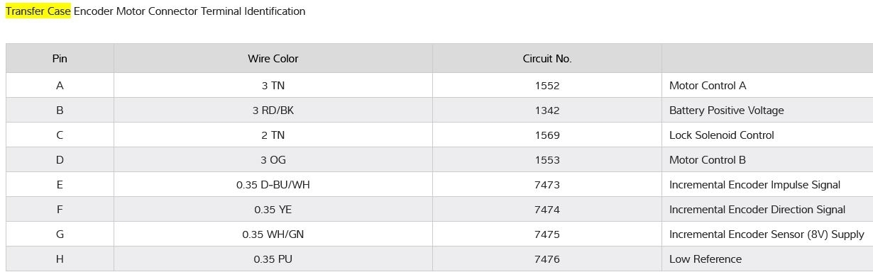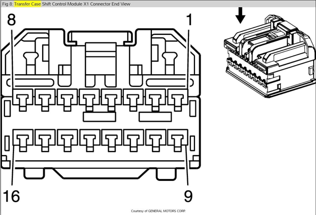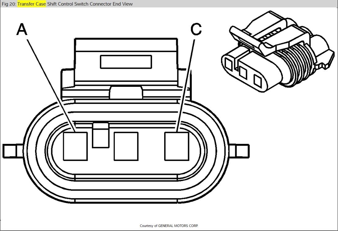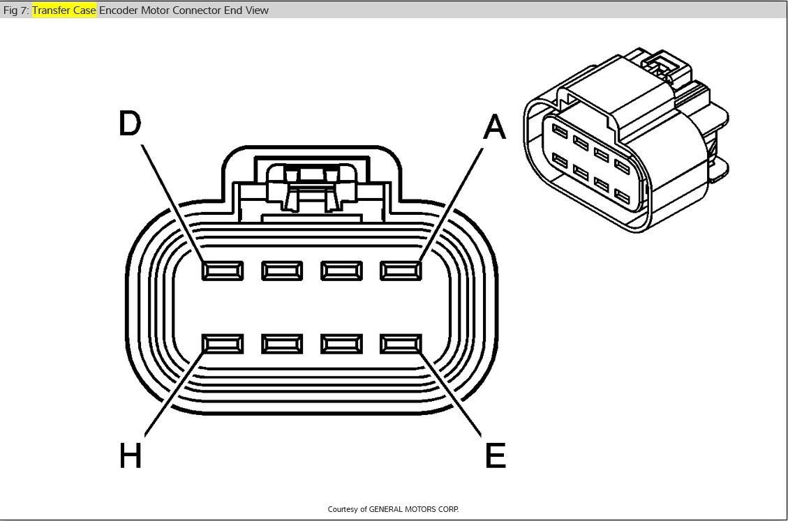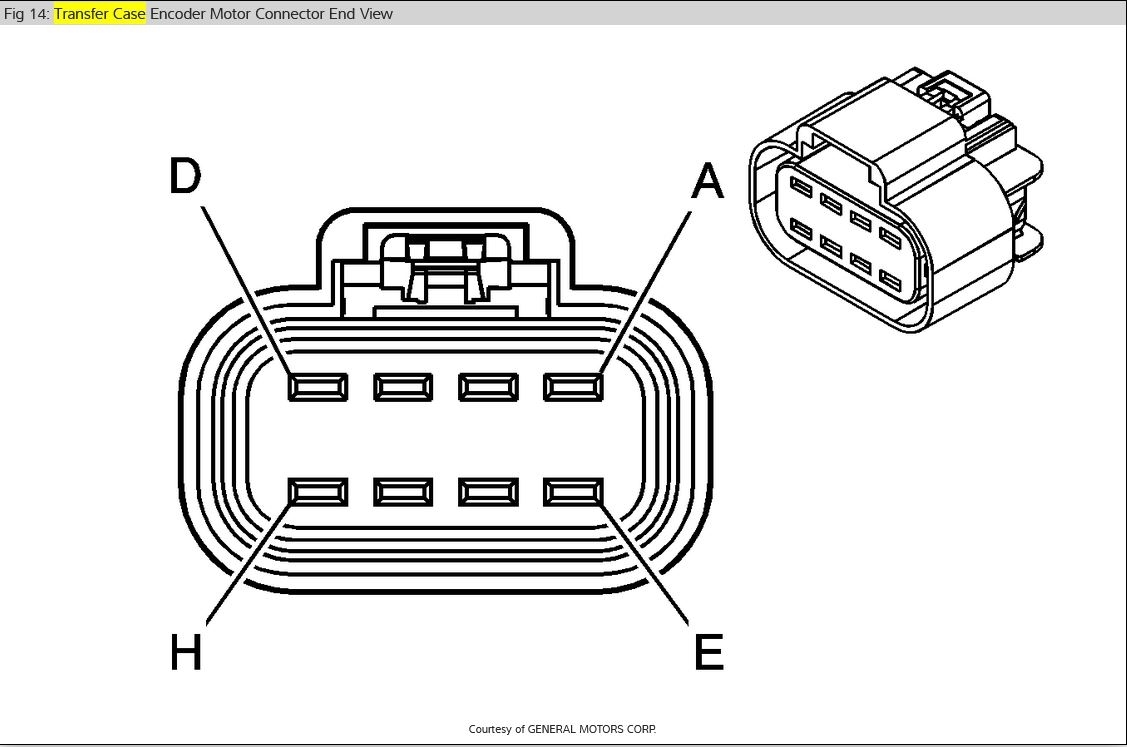 I have the truck listed above with the NQH Magna Power-train transfer case. The "Service 4x4" notice has come on and I would like to test the transfer case shift motor to see if it is bad. Do you have the electrical schematic of the electrical connector on the transfer case shift motor?
