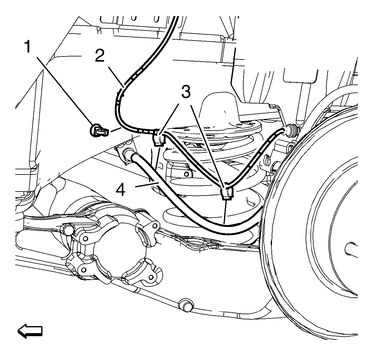 5. Remove the wiring harness (2) retainers (3) from the brake hose (4).