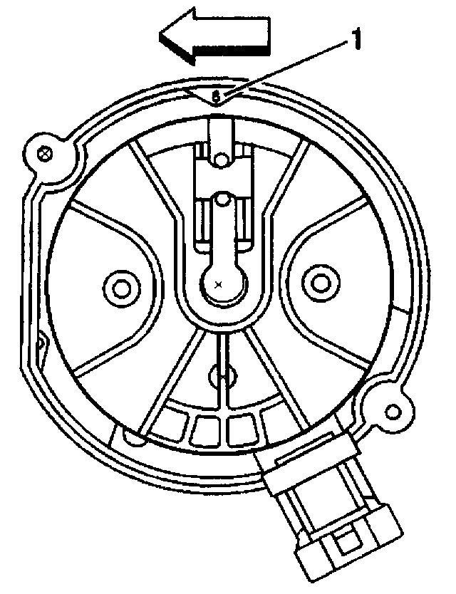 9. Once the distributor is fully seated, align the distributor rotor segment with the number 6 pointer (1) that is cast into the distributor base.
