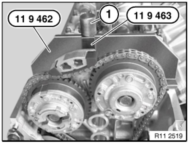 Release screw ( 1 ) and remove special tools 11 9 463 / 11 9 462 from exhaust camshaft.
