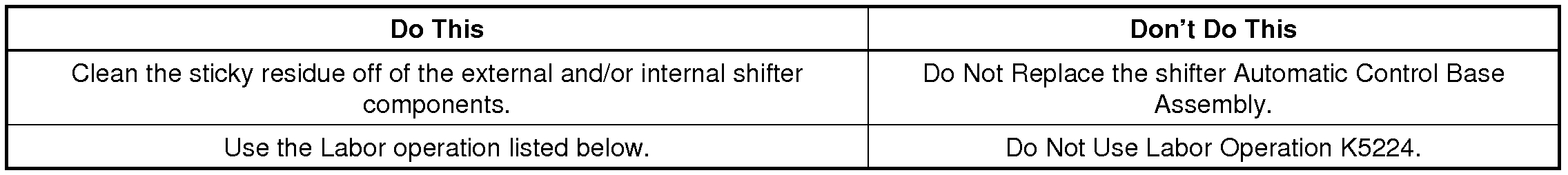 Some customers may comment about an intermittent squeaking noise coming from inside the automatic transmission control area and/or the lower console area. Customers may also comment that the shifter is difficult to operate. Inspection may reveal a sticky residue on the external surfaces of the automatic transmission control.