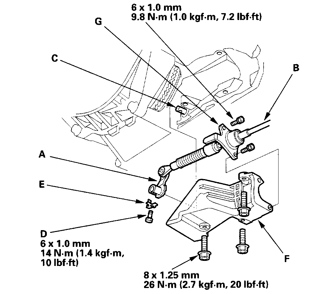 15. Install the shift cable cover (F), then install the shift cable holder (G) on the cover.