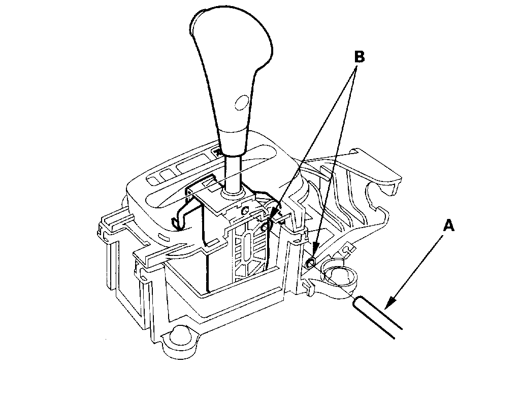 20. Insert a 6.0 mm (0.24 inch) pin (A) into the positioning hole (B) on the shift lever bracket base through the positioning hole on the shift lever assembly.
