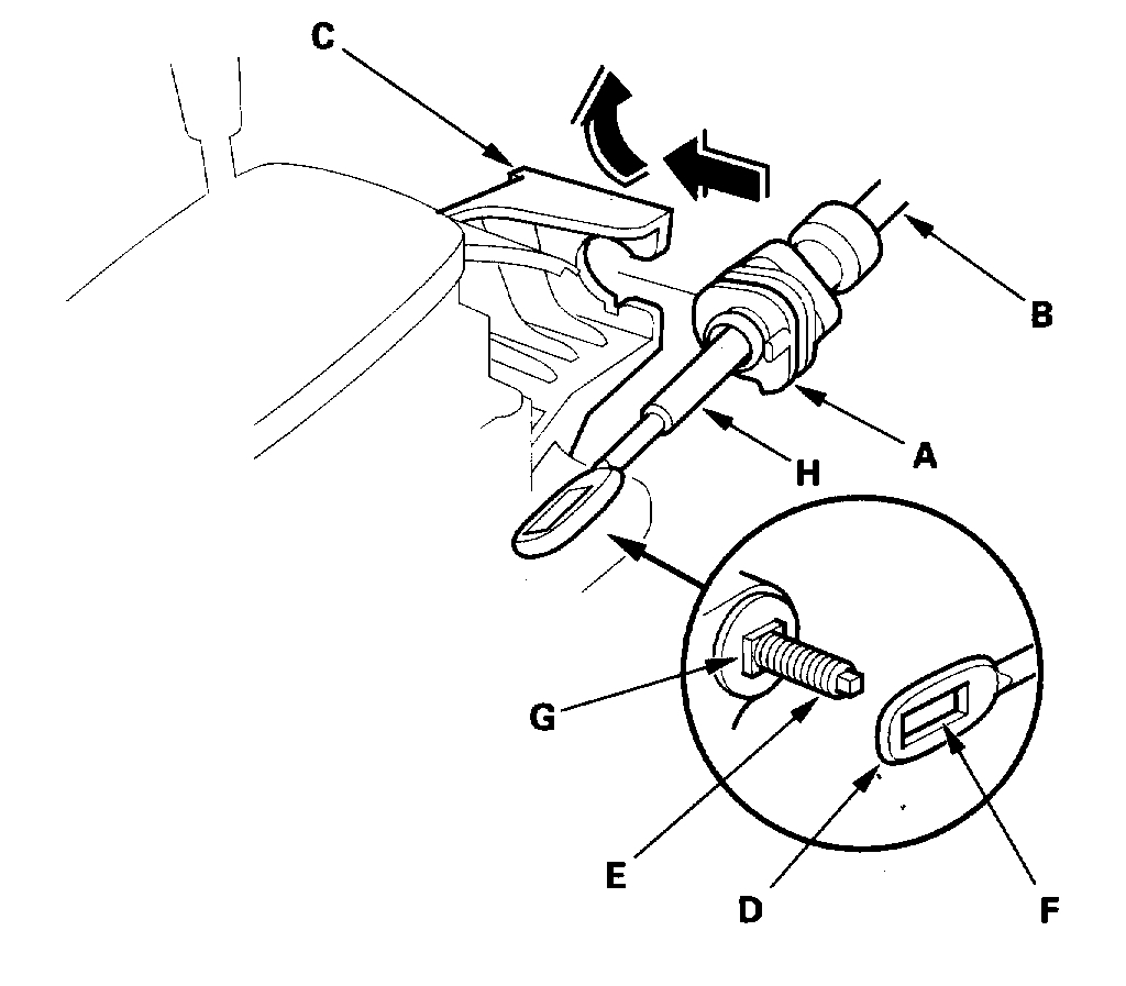 21. Rotate the socket holder (A) on the shift cable (B) counterclockwise a quarter turn, then slide the holder onto the shift lever bracket base (C). Install the shift cable end (D) over the mounting stud (E) by aligning its square hole (F) with the square shape (G) at the bottom of the stud. Rotate the holder clockwise a quarter turn to secure the shift cable.