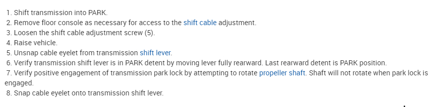 As for these diagrams, I think the difficulty I'm having is with a lot of the vocabulary. I'm assuming by the context of the instructions that the gear eyelet on the "transmission shift lever" is referring to the connection between the cable and the shifter. But I am not sure what the propeller shaft is, or why I would have to raise the vehicle to get to that part, so I'm also assuming it's under the car.