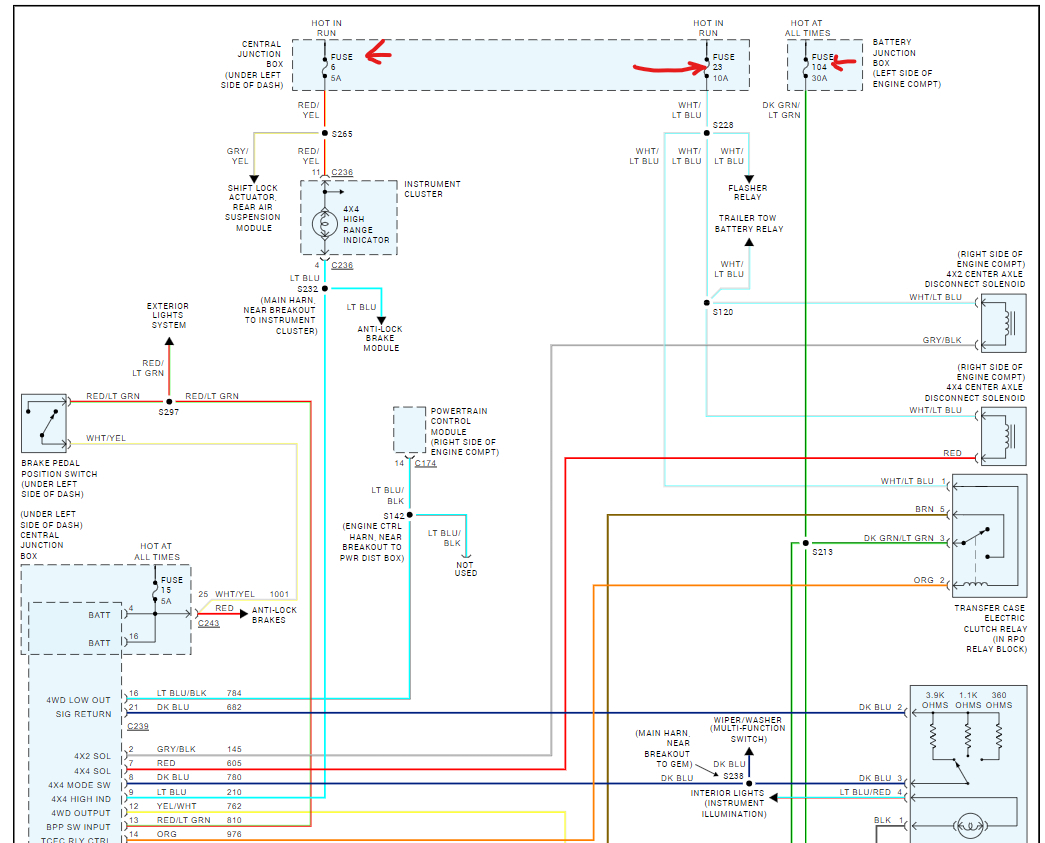 The #1 reason the truck gets stuck in four-wheel drive is the transfer case actuator motor goes bad, but you should check the fuses as well, here is the wiring diagrams for the system so you can see how it works, and which fuses to test for power this guide will help: