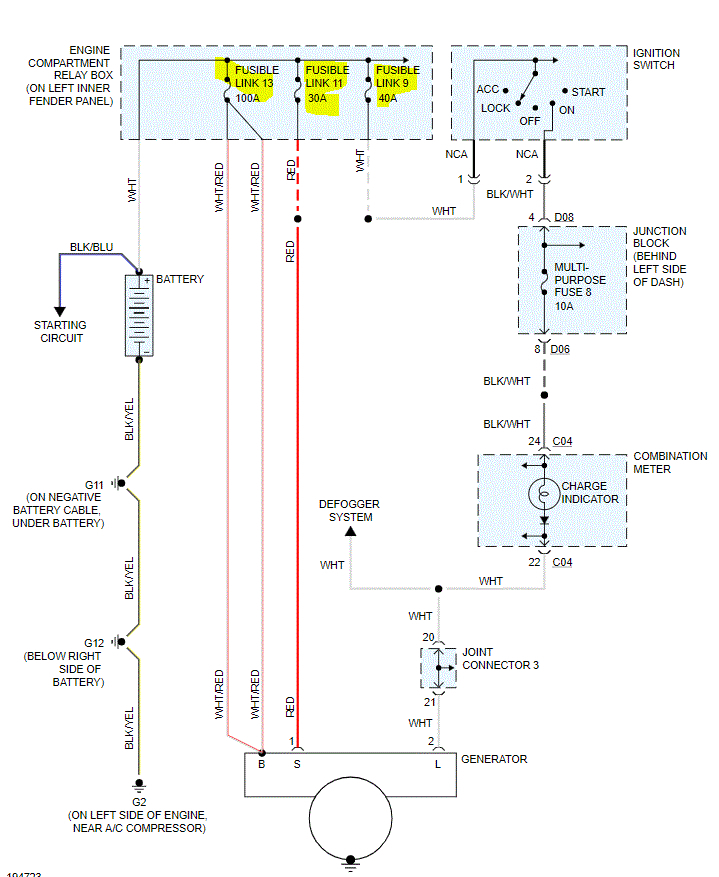 If you look at the attached pic, I need you to check a few fusible links. The pic is the entire wiring schematic for the charging system. If you follow the aforementioned link, that will tell me if power from the alternator is making it to the battery. If the battery is going dead when driving, either you have one heck of a draw or it isn't recharging. Pic 2 shows the orientation of the fusible link. Confirm there is power both in and out from the link.