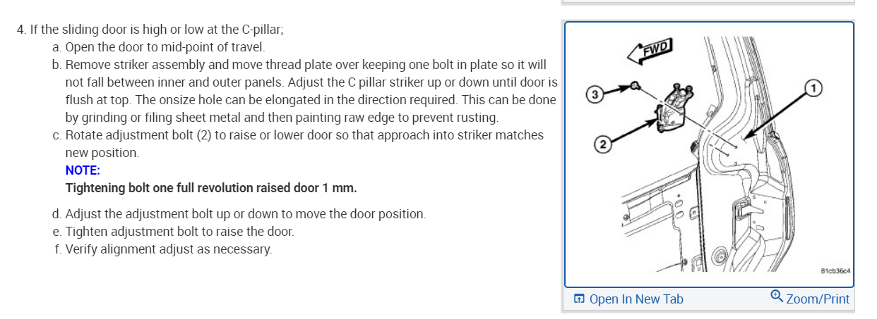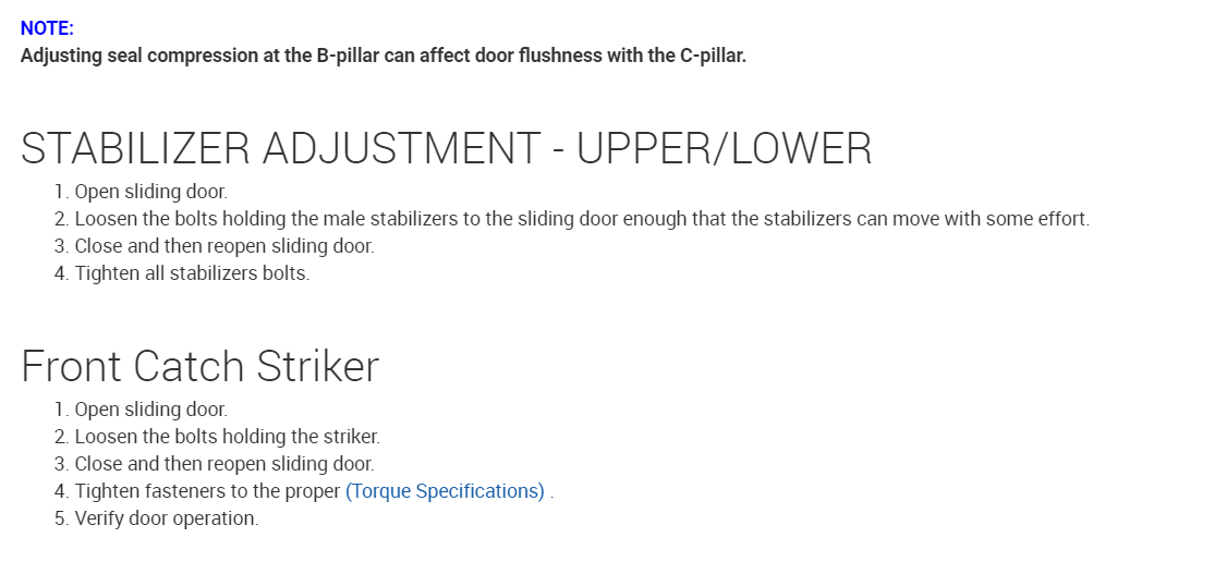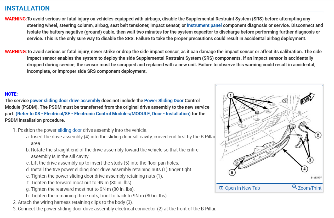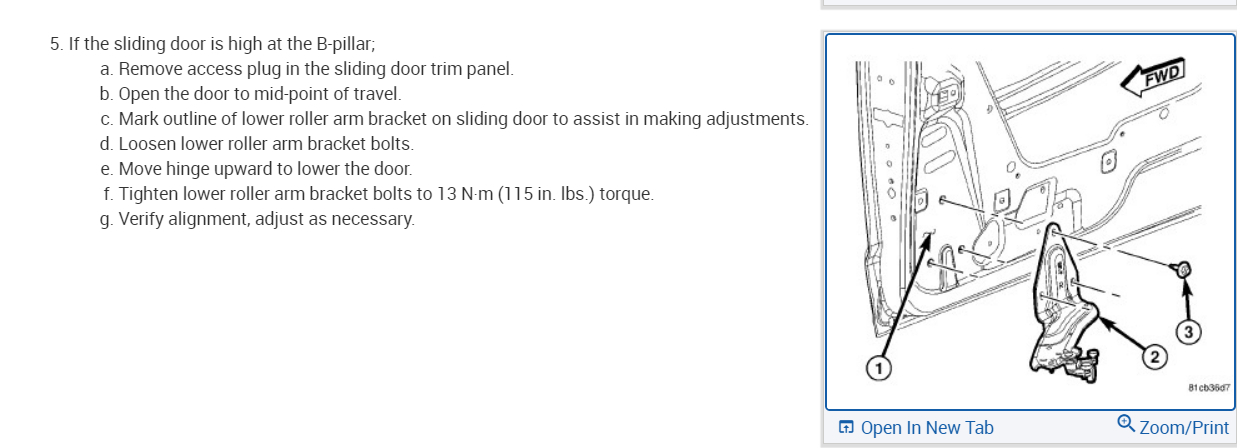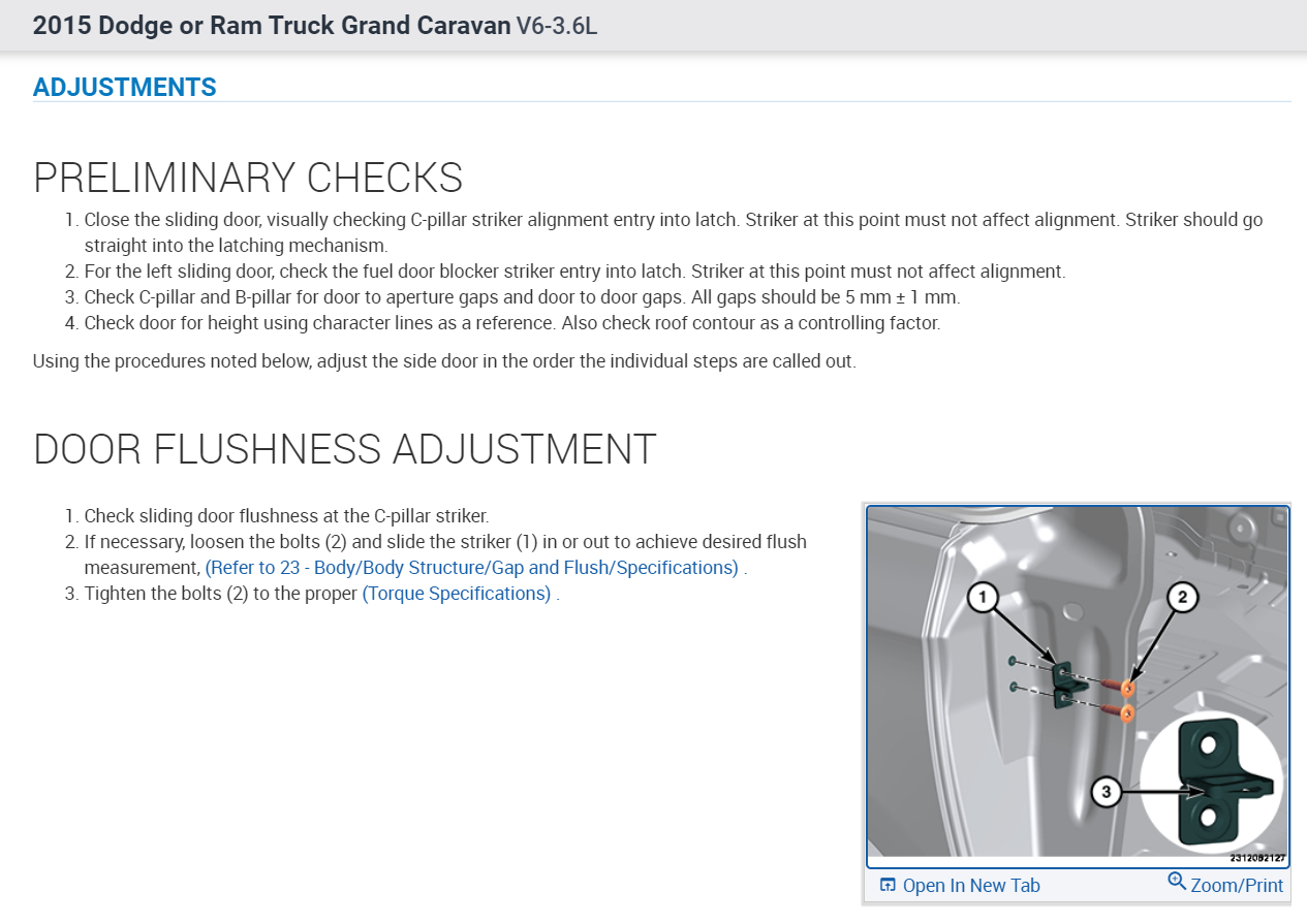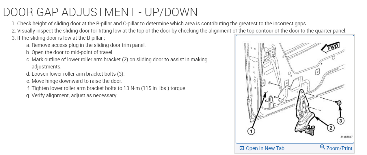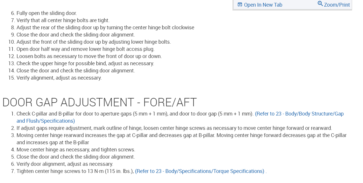 In order for the power sliding door system to function properly the door must move freely and smoothly. The power sliding door system can accommodate for some minor changes in the effort required to move the door. However, in extreme conditions the door may need to be mechanically adjusted for proper fit. (Refer to 23 - Body/Doors - Sliding/DOOR, Sliding/Adjustments) .