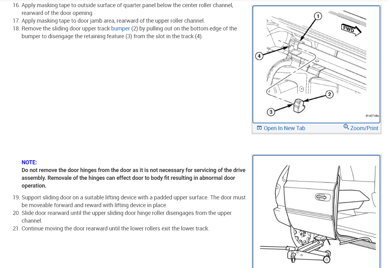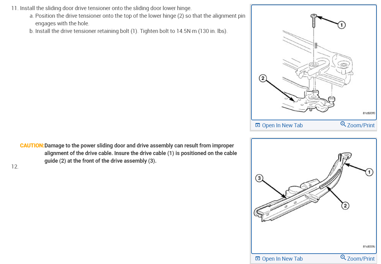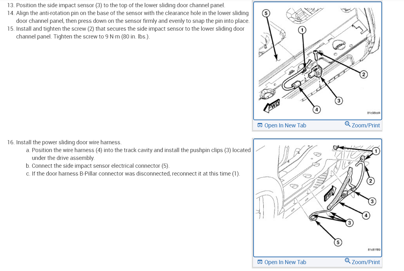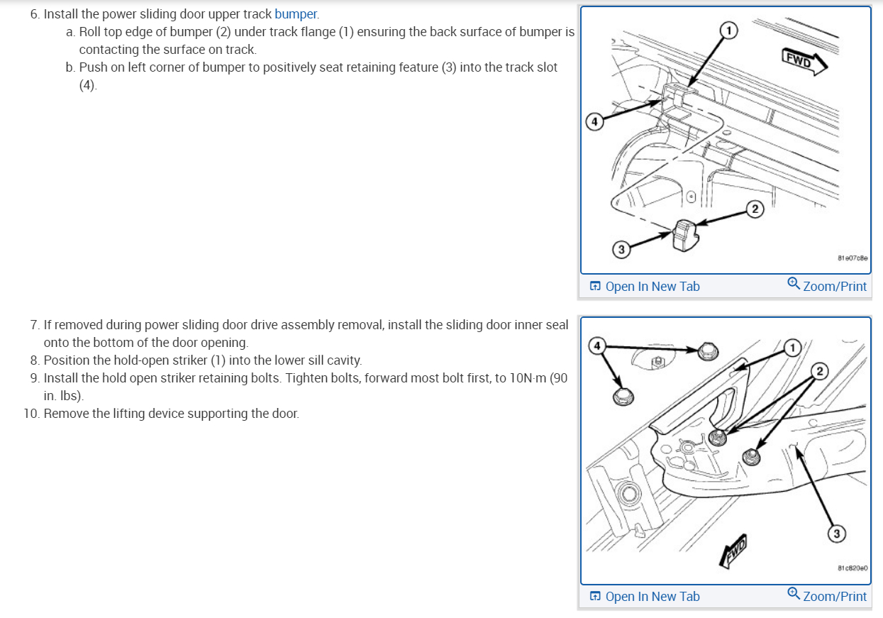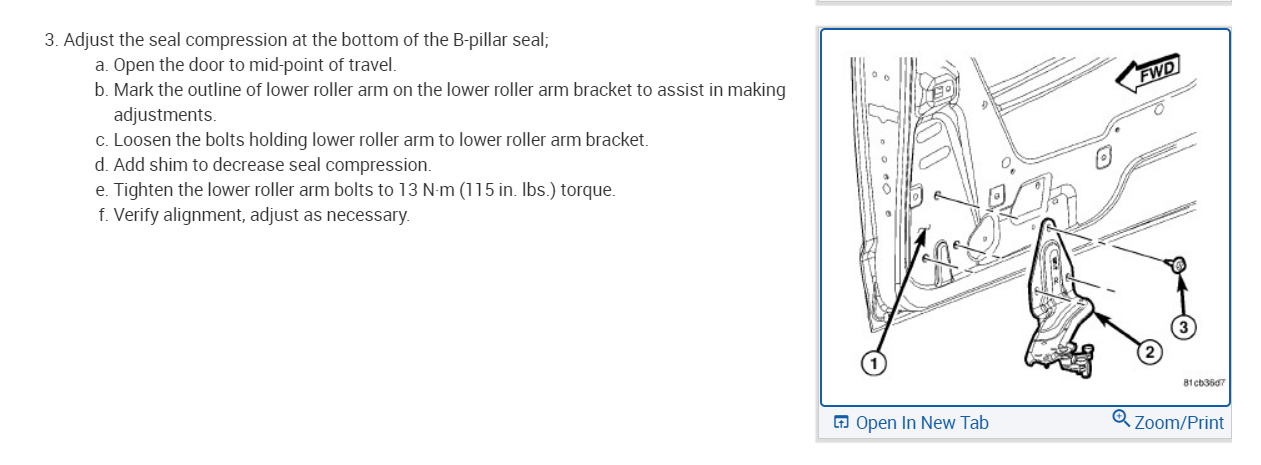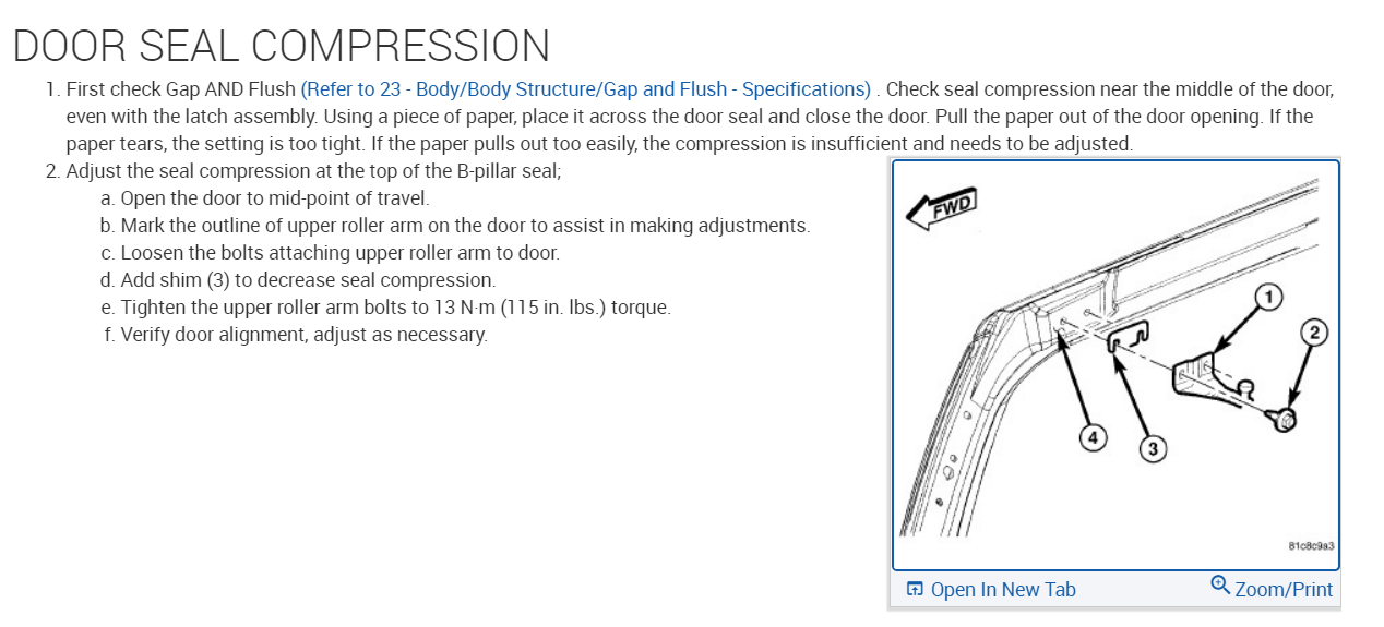 In order for the power sliding door system to function properly the door must move freely and smoothly. The power sliding door system can accommodate for some minor changes in the effort required to move the door. However, in extreme conditions the door may need to be mechanically adjusted for proper fit. (Refer to 23 - Body/Doors - Sliding/DOOR, Sliding/Adjustments) .