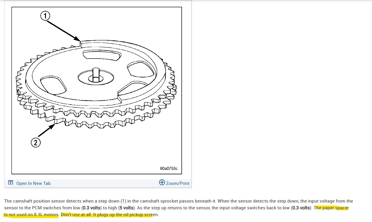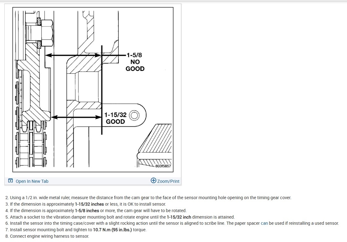 • New Cam Position sensor installed per FSM (original sensor installed too deep had damage/material removed from end of sensor)