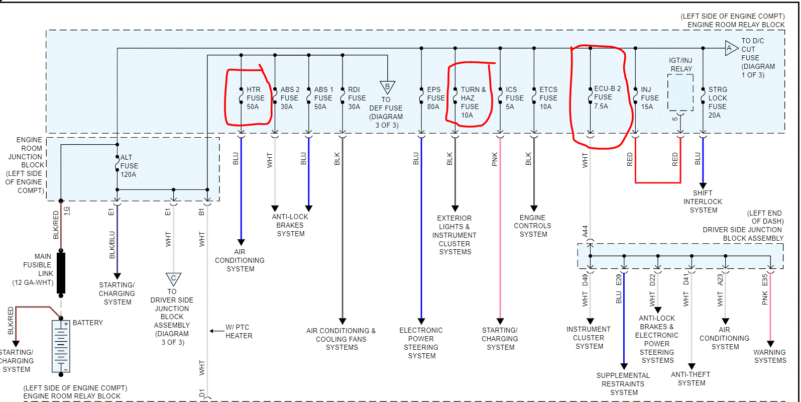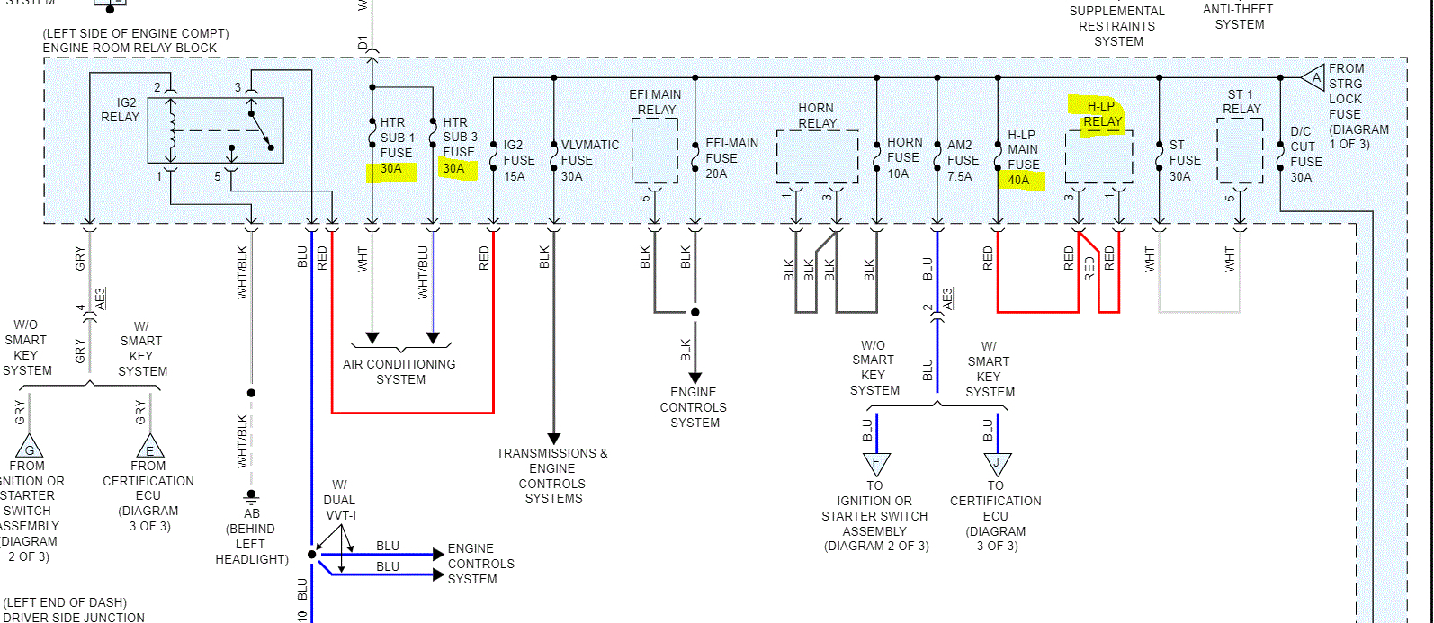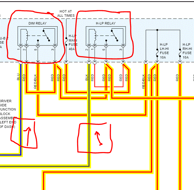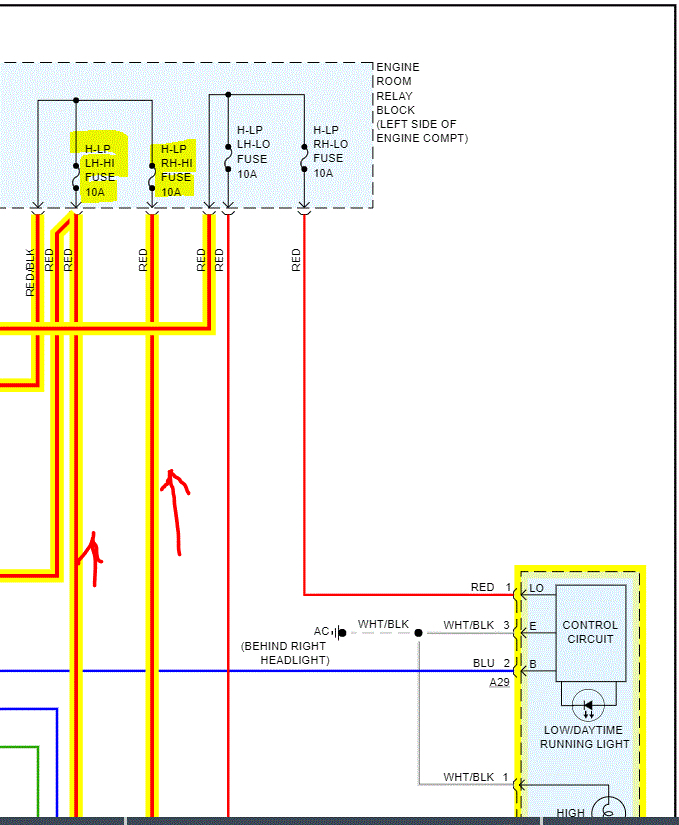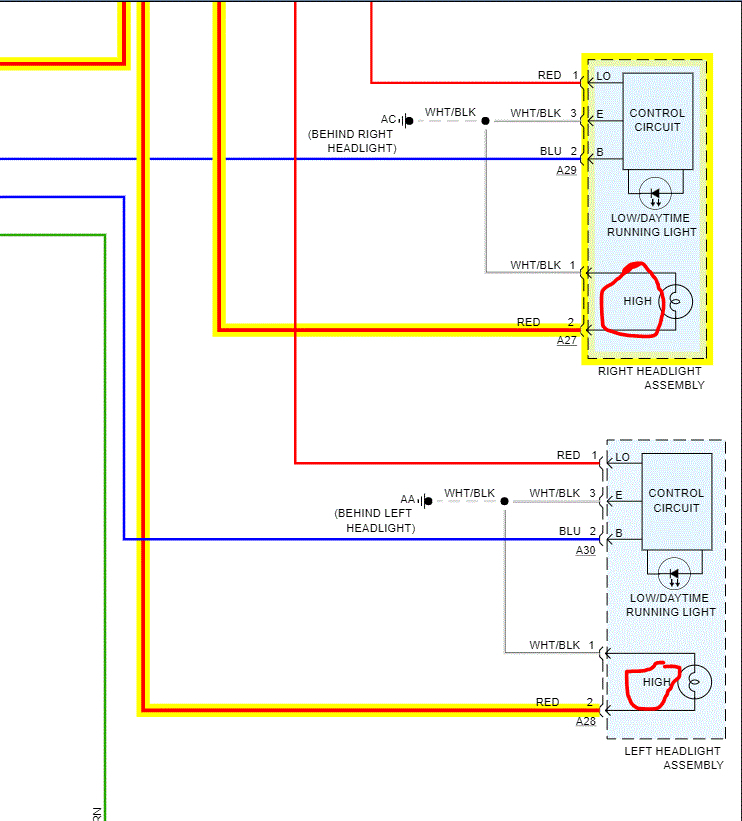 2) Next, look at pic 2. It shows the power supply to the headlights high beam. Start there and lets work backwards to see where power is lost. I highlighted the power supply for high beam. Check those wires for power. If none, move on to step 3