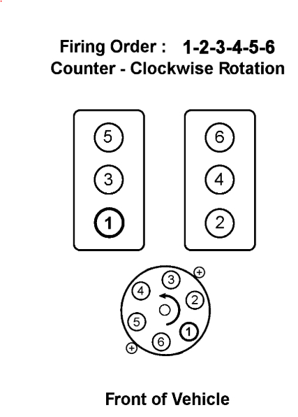 Firing order for spark plugs and a diagram for spark plug wire placement from distributor to the spark plugs.
