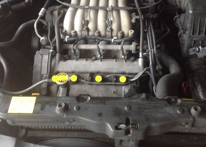 They are hiding under the spark plug boots on the top of the engine. See the attached picture. Those covers are removed and the plugs are in the pocket under them. You need a plug socket and an extension to reach them.