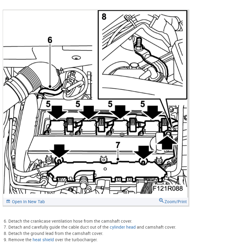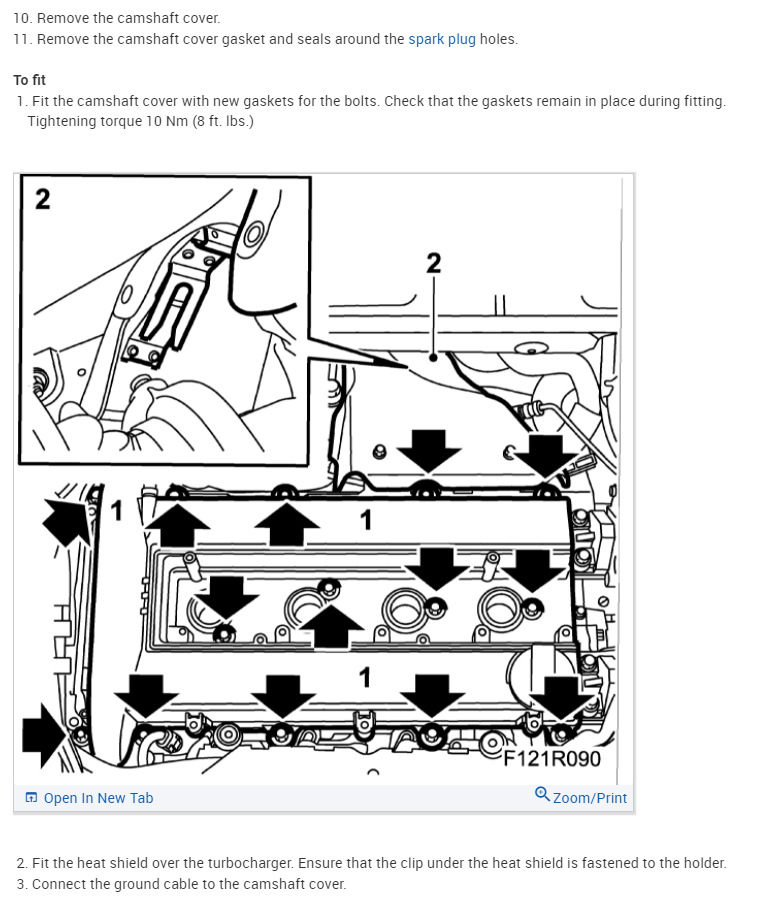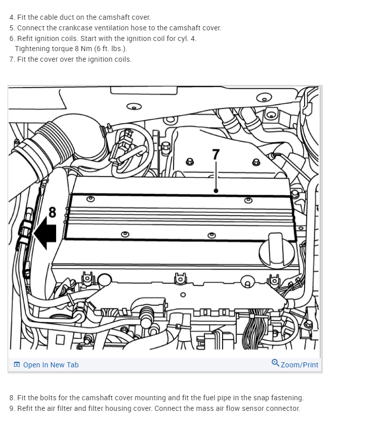 After reinstalling the valve cover, the install the spark plugs and torque them in. It's a good practice to check the gap on the spark plugs before installing them. The gap spec is with the torque spec for the spark plugs. The first six diagrams are for the valve cover (camshaft cover).