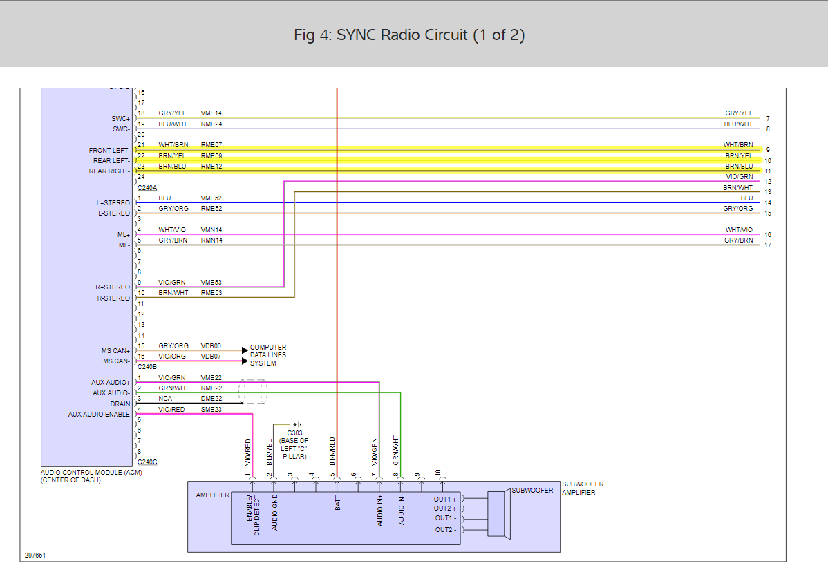 Hello, so I was attempting to install a aftermarket sub and amp and I accidentally cut into the violet/red wire, which shows as the Aux Audio Enable, when I did it sparked. And ever since I’ve had no audio whatsoever, and it’s telling me my 911 assist has a fault. I’ve checked all fuses I’m aware of, under hood, passenger area, and trunk fuses. I don't know what to do, I need my music, I’m in my car way too much not to have any. Please help