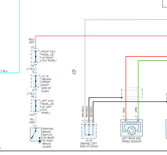 I attached the wiring diagram for the park brake switch. You have your choice of place to inspect this because it looks like it runs through three intermediate connectors and changes color a couple times.