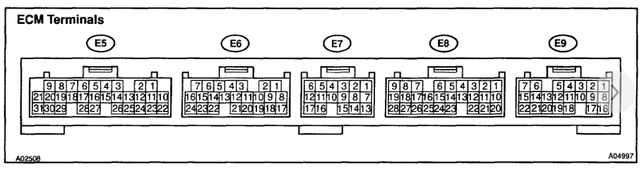 Here is a pin chart of the ECM connectors. This is looking at the connector so the numbers just go right to left.