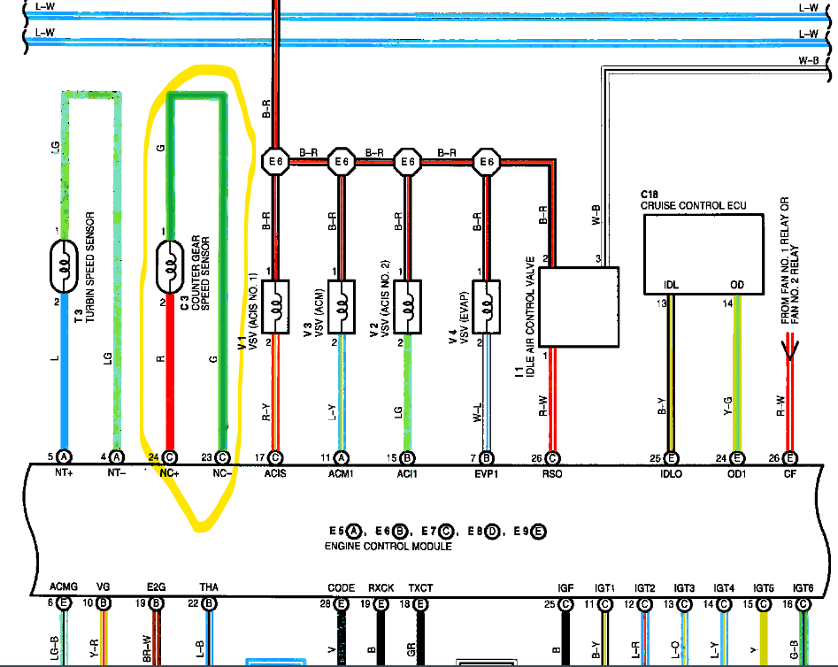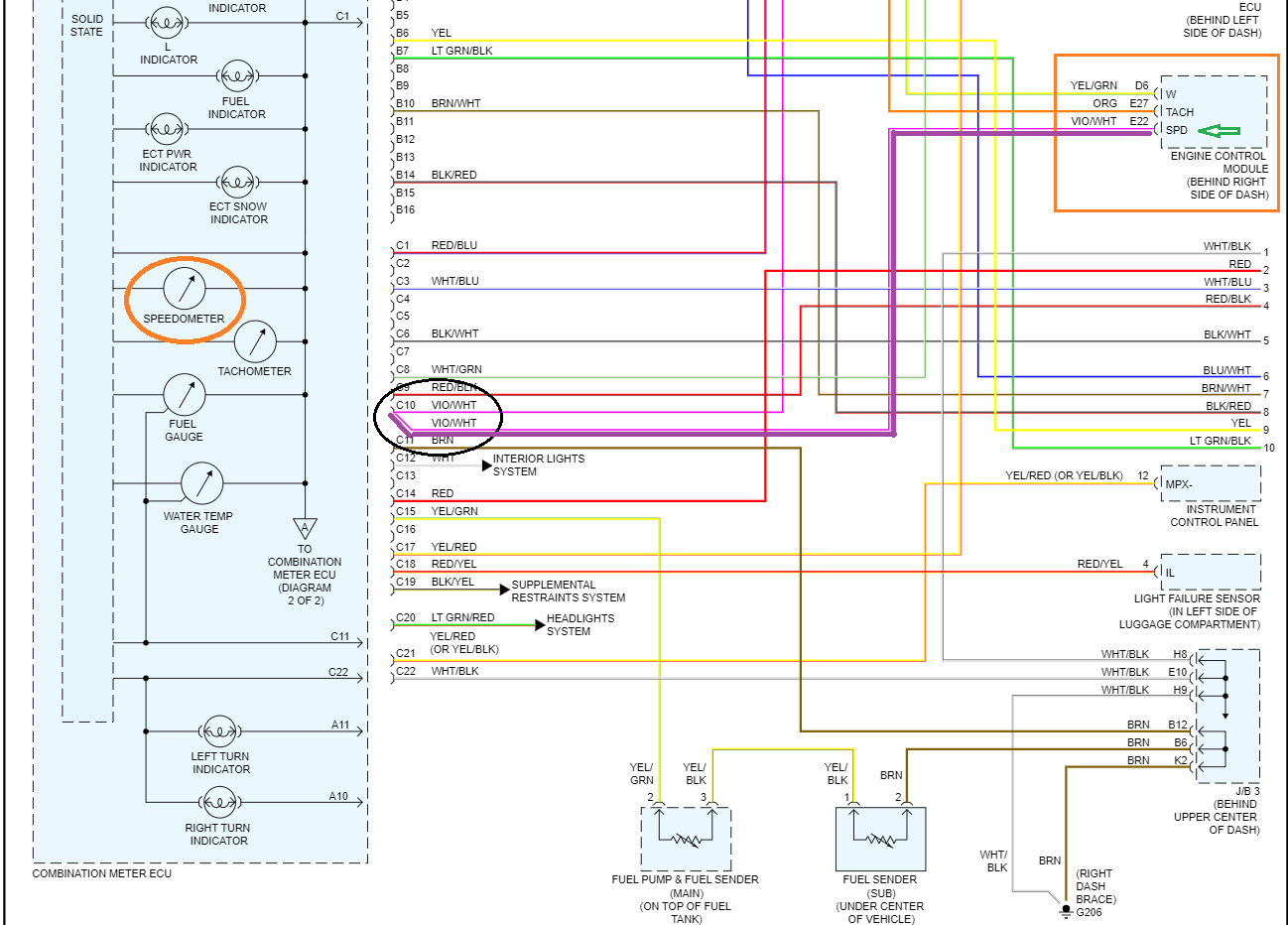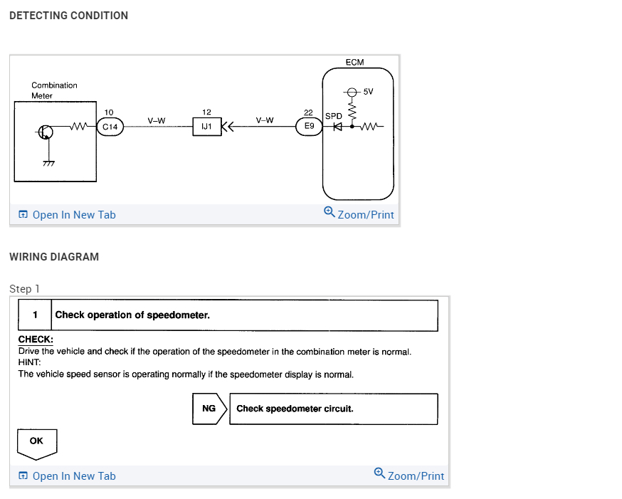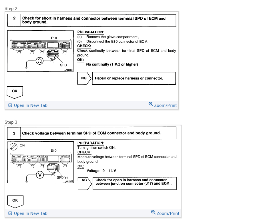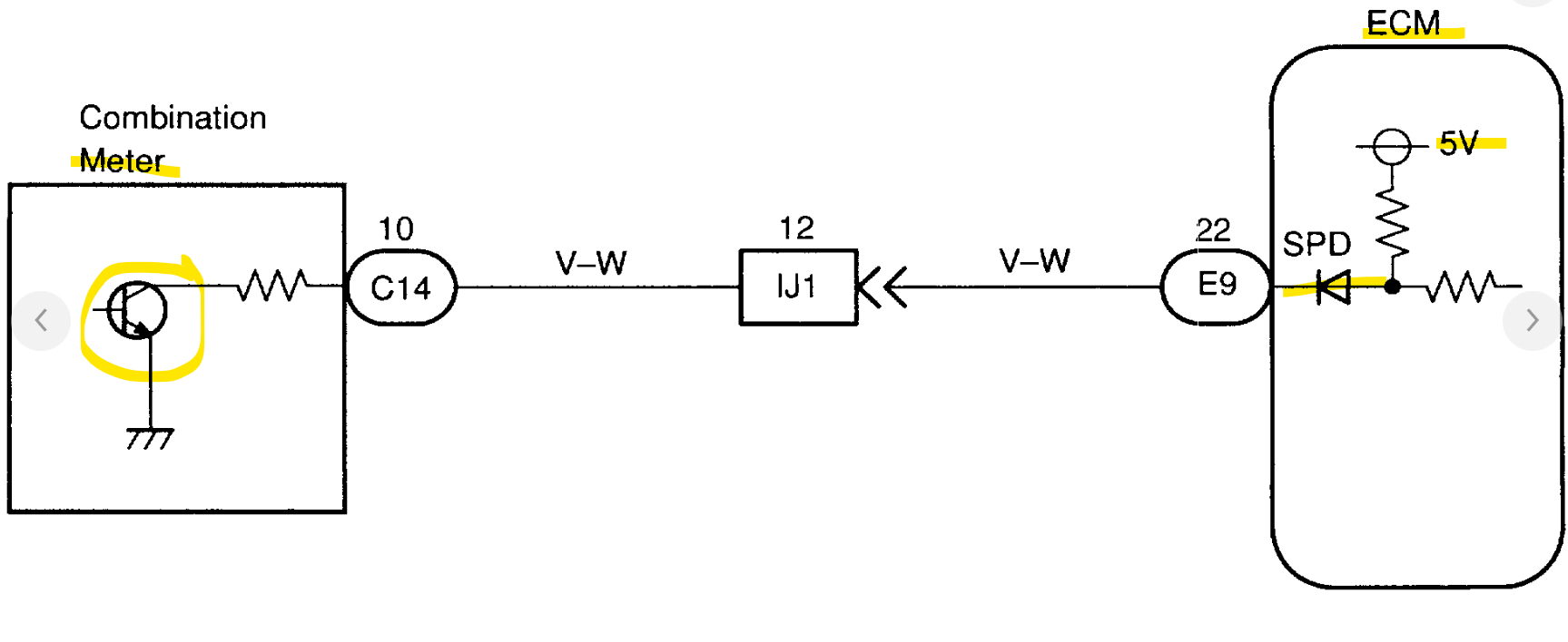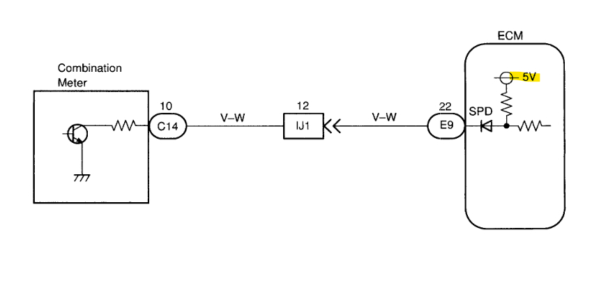 The speedometer stopped working after coil replacement. I have changed the ABS Module, it worked and stopped again. I used another speed clock and check, and it didn't work. I changed the ABS Actuator without connecting the brake pipes and it didn't work. I got another ECM and program it but it still didn't work. So, I began circuit by checking power supply to ABS module from ECU-B Fuse and there's power supply. I checked the Speedline wire violet/white; from ECM E9(22) to speed clock C3(10) and there was continuity, I measured the voltage with ignition on and it read 4.67volts. I also checked the Speedline wire (yellow wire) from ABS ECU B (16) to speed clock A (17) with engine on and gear shifter in D-position with one wheel spinning and it read 10volts. Finally, I measured voltage on the ABS sensor FR and FL, with the sensor disconnected it reads 0.5volts and when you plug in the sensor connector it drops from 0.5 to 45-50mv. At this point, I want to know how many volts the ABS ECU uses to control the sensor.