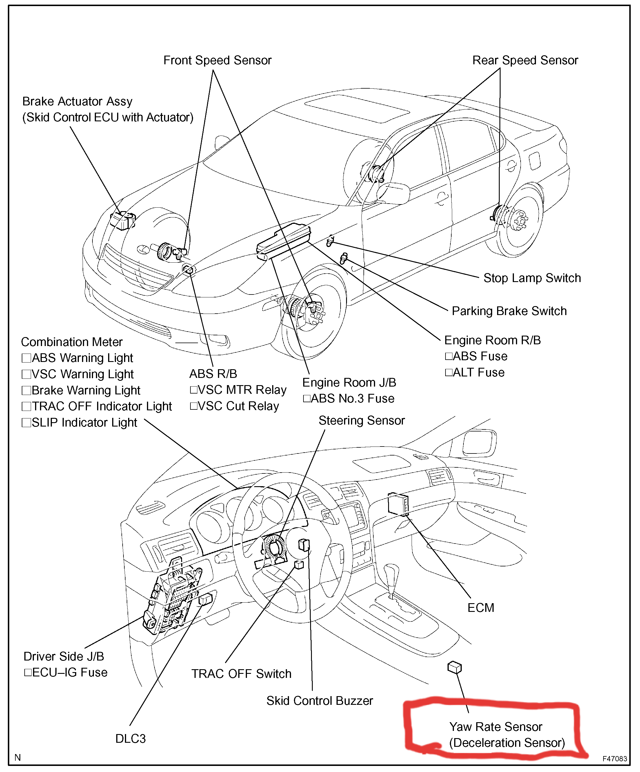 Thank you for getting back to me. I've searched the center console but I can't find the yaw rate sensor. According to that image, it is supposed to be here but I can't locate it. The VIN of the vehicle is JTHBA30G045011785. I'd appreciate any history you can help me pull up about the car and any help I can get about the location of the Yaw rate sensor. Thank you