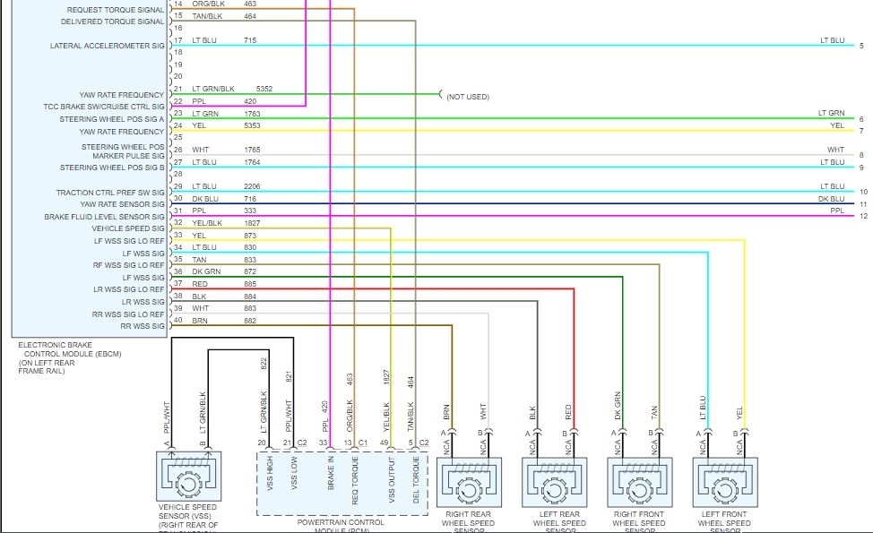 ^ Wheel speed sensors (WSS) - As the wheels spin, toothed rings interrupt magnetic fields in the wheel speed sensors. This causes each wheel speed sensor to generate an AC signal. The EBCM uses these AC signals to calculate the wheel speed. Any imperfections in the toothed ring, such as a missing or damaged tooth, can cause an inaccurate WSS signal.
