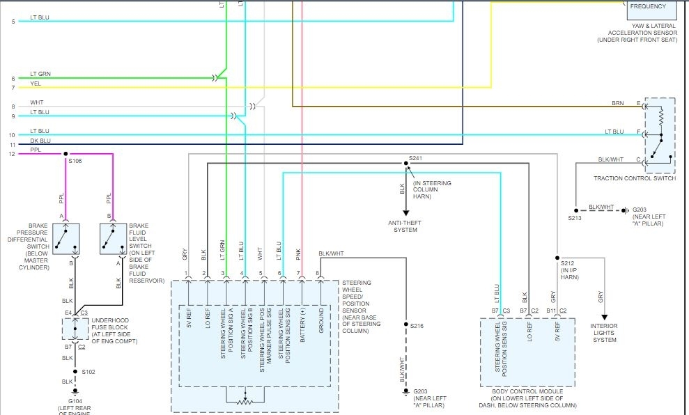 ^ Steering wheel position sensor - The electronic brake control module (EBCM) receives several inputs from the steering wheel position sensor. 3 digital square wave signal inputs are wired directly to the EBCM harness connector, however, only signals A and B are used or monitored. The failure of the index pulse signal does not effect VSES function. The body control module (BCM), which receives an analog steering position sensor input, transmits steering position data on the serial data line. The EBCM monitors the serial data information as an added fail-safe for the steering position sensor circuitry. Battery voltage is supplied to the digital portion of the steering wheel position sensor from the cruise control fuse. The analog portion of the steering wheel position sensor is supplied a 5-volt reference from the BCM. This circuit is also used for a lamp dimming function.