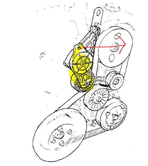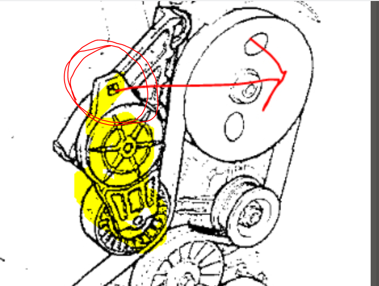 There should be a place on the tensioner to install either a 1/2" ratchet or a 3/8" ratchet. I recopied the pic from above and circled what you are looking for. Let me know if you find it. If you do, turn it clockwise to loosen the belt.