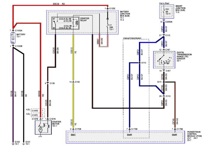 Next, there is a switch on the clutch pedal that prevents the vehicle from starting if the clutch isn't depressed. Have you checked that? Take a look at pic 1 below. It shows the wiring to the clutch switch. The green /. brown wire should receive power when you turn the key to the start position. Power should then come out from the black / white wire to ground.
