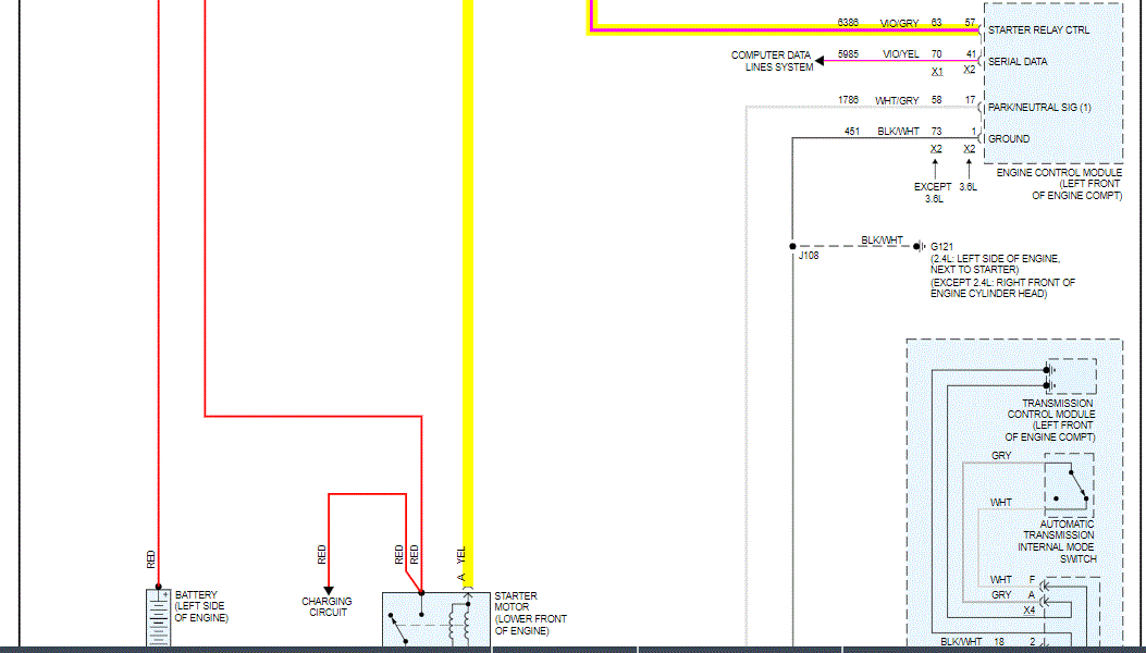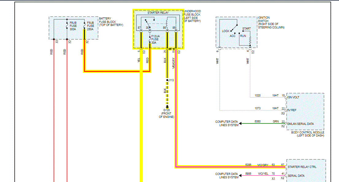 When the ignition switch is placed in the START position, a discrete signal is supplied to the body control module (BCM) notifying it that the ignition is in the START position. The BCM then sends a message to the engine control module (ECM) that crank has been requested. The ECM then verifies that the clutch pedal is depressed or the transmission is in Park/Neutral. If it is, the ECM then supplies 12 V to the control circuit of the starter relay. When this occurs, battery voltage is supplied through the switch of the starter relay to the starter solenoid.