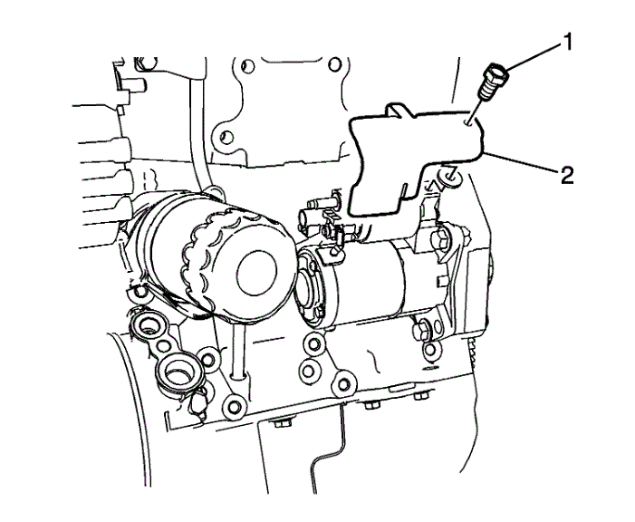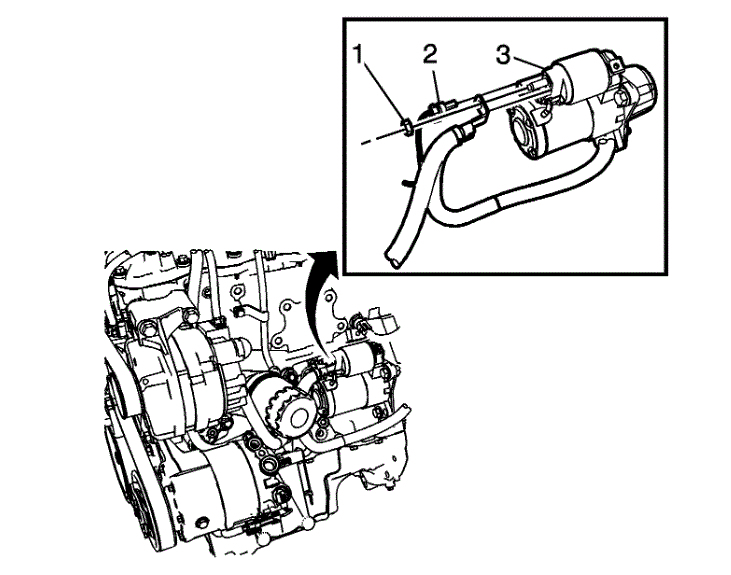 6. Remove the battery positive nut (1) and the engine harness connector (2), from the starter solenoid (3).