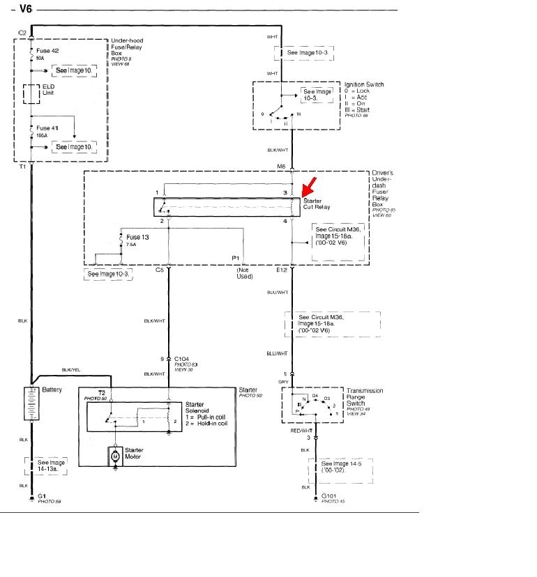 Your circuit does include a relay, but it is in series with the ignition switch, meaning the switch still has to carry that high current. The relay is only used as a means of interrupting the circuit as part of the anti-theft system. It is called the "starter cut relay" and it is located inside the car in the fuse box. If you are hearing the relatively light click of that relay when you turn the ignition switch to "crank", the ignition switch, the neutral safety switch, and that half of the relay are working properly, so we can move on to the high-current starter circuit.