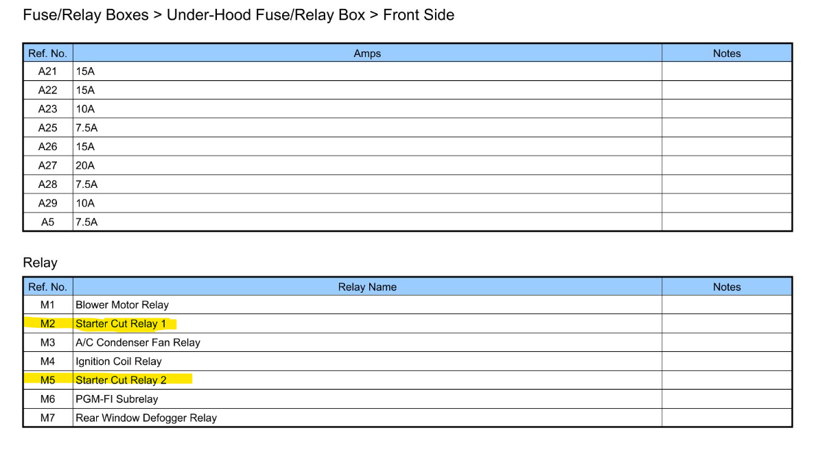 The 1st diagram is the under-hood fuse panel, M2 and M5 are the Starter Cut Relays marked in green, Fuse 2-5 is also marked in green.