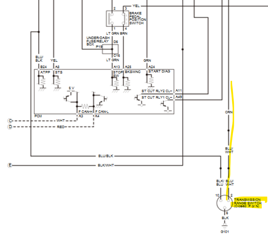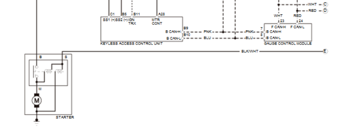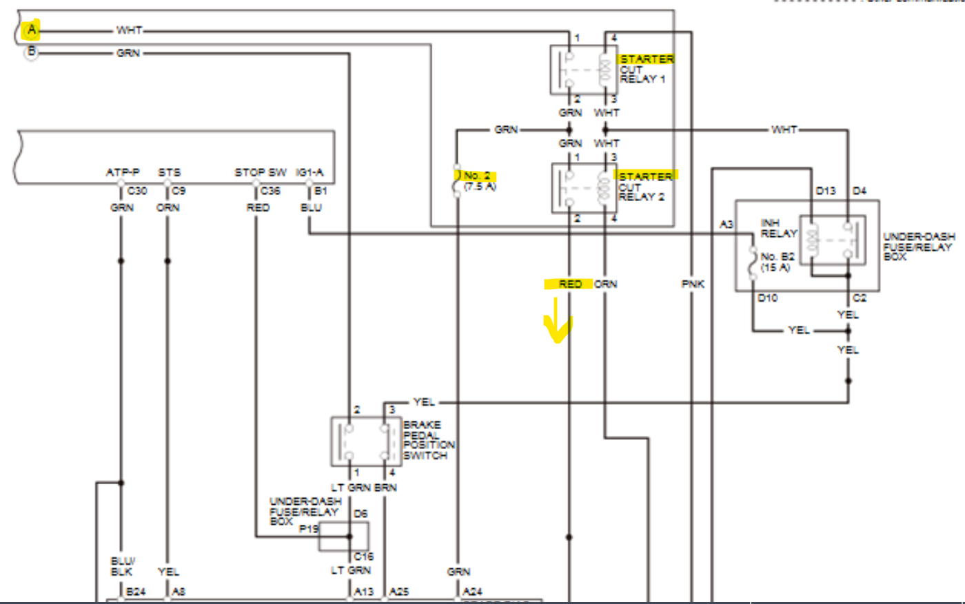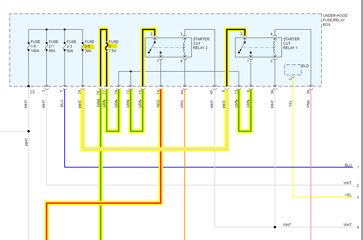 In the 4th diagram, which is an aftermarket diagram, fuse 2-5(30amp) feeds power to Starter Cut Relay number1, then to Starter Relay Cut number 2, which in turn feeds power to the Starter via the Red wire. But both relays need to be energized for this to happen. The fuse labelled 5(7.5amp) goes to the PCM on a green wire as a signal that Relay 1 has energized.