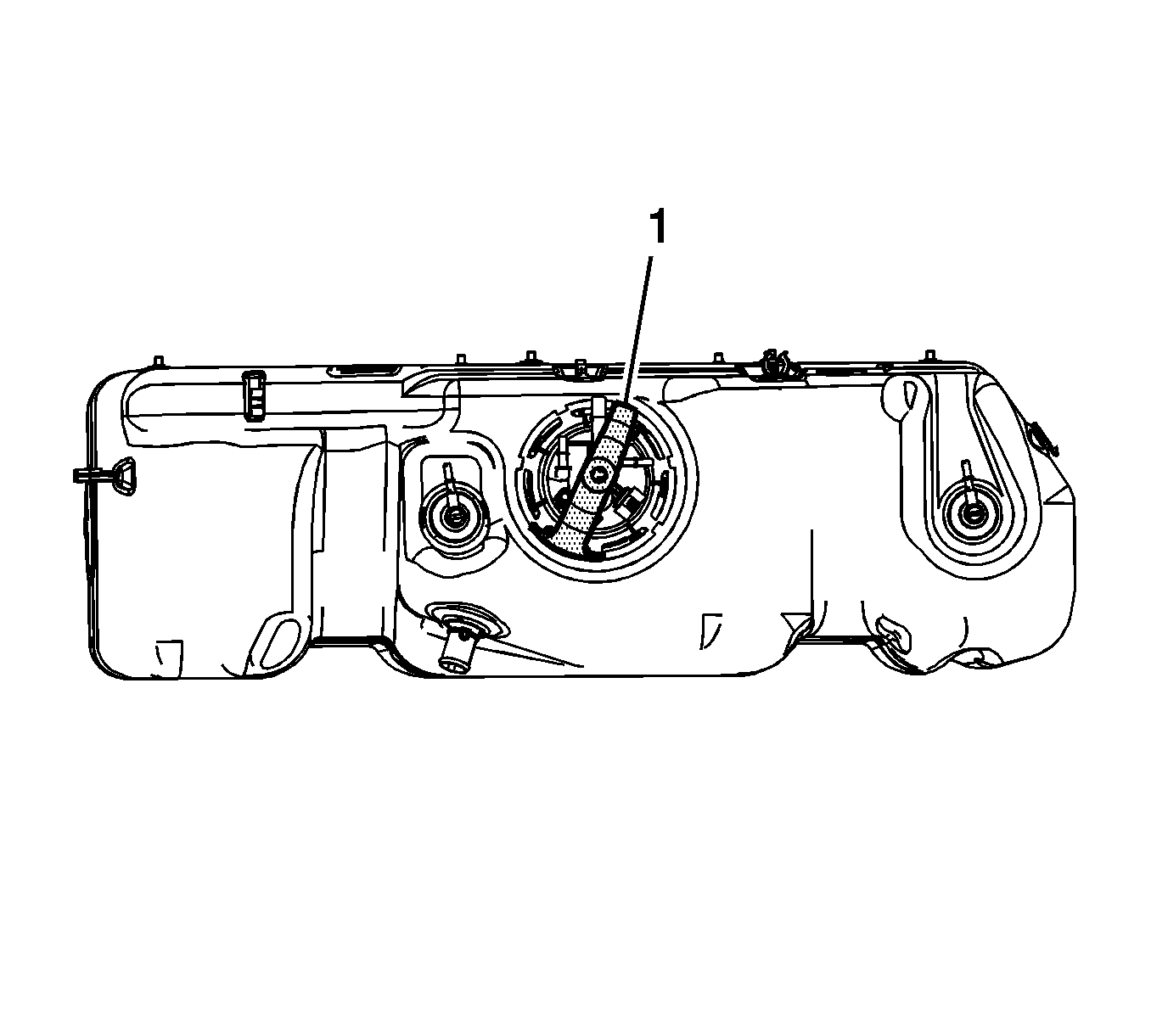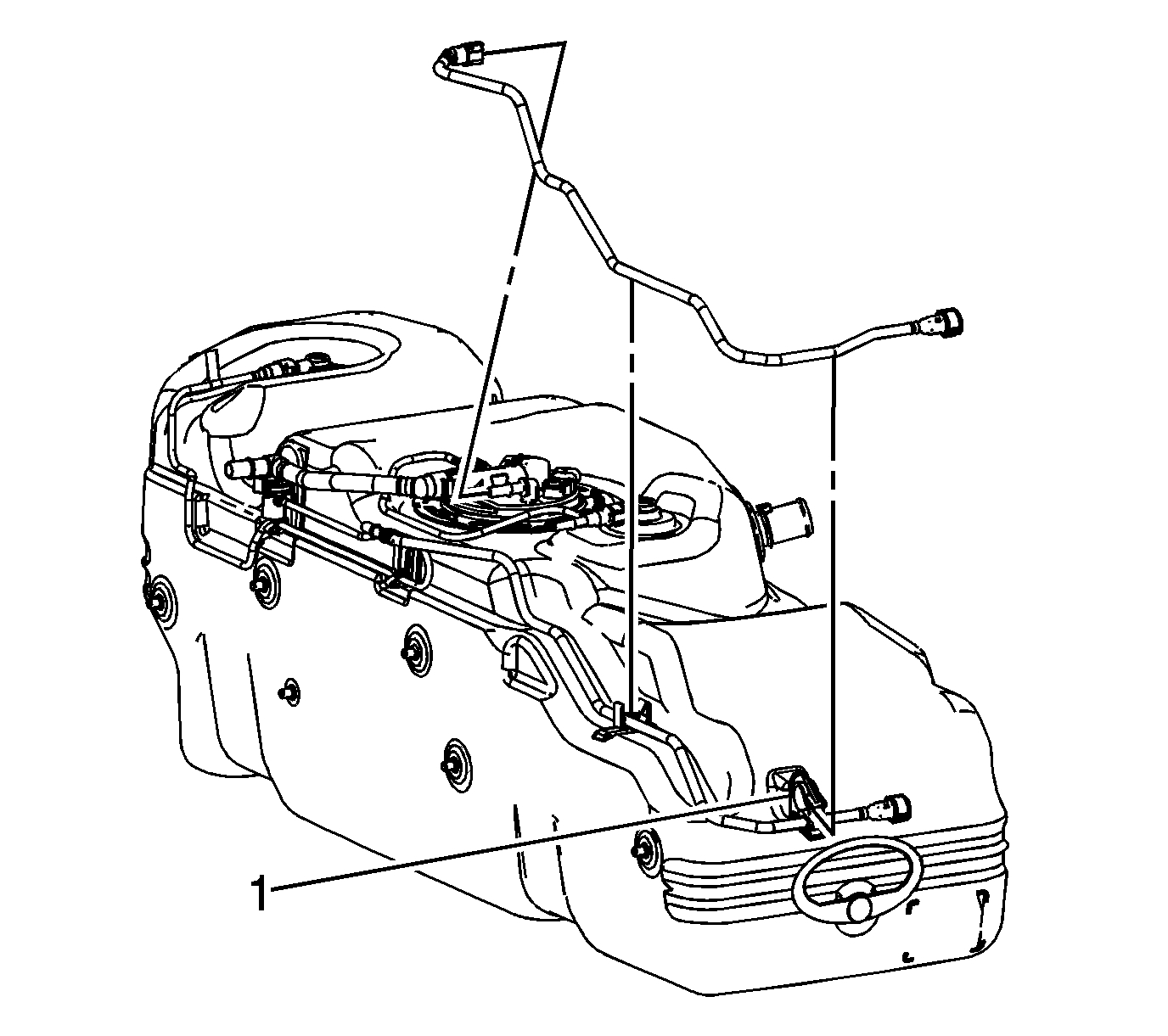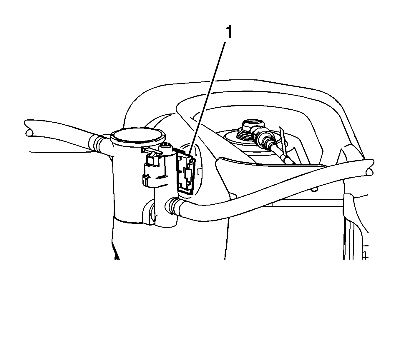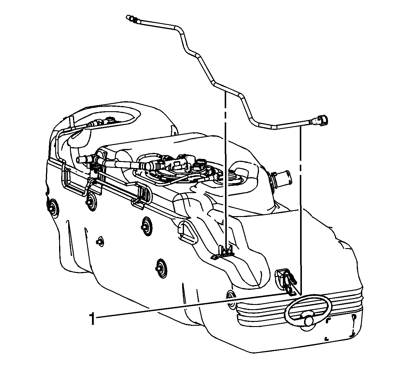 20. Ensure that the EVAP canister vent solenoid engages the fuel tank bracket retainer (1).
