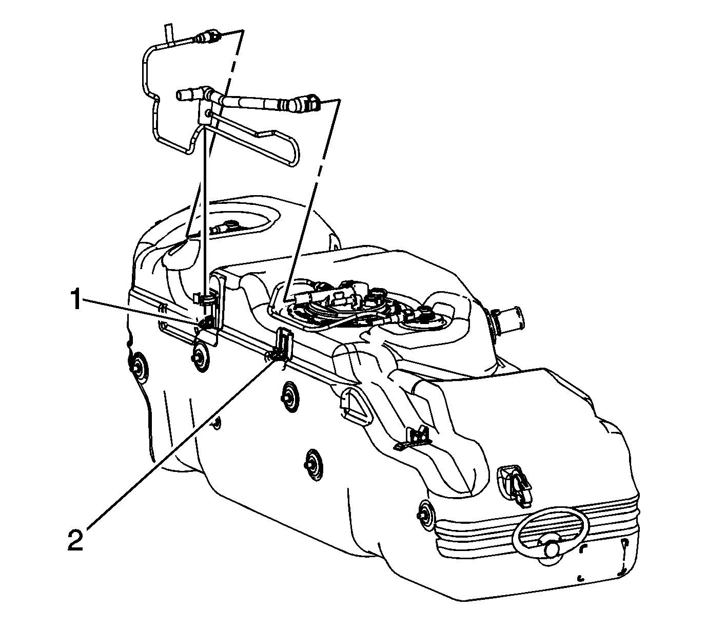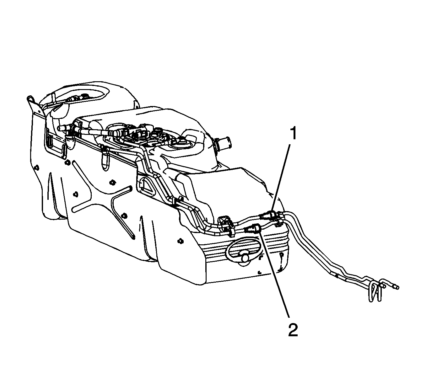 4. Disconnect the fuel tank fuel feed (1) and EVAP (2) line quick connect fittings from the chassis lines.