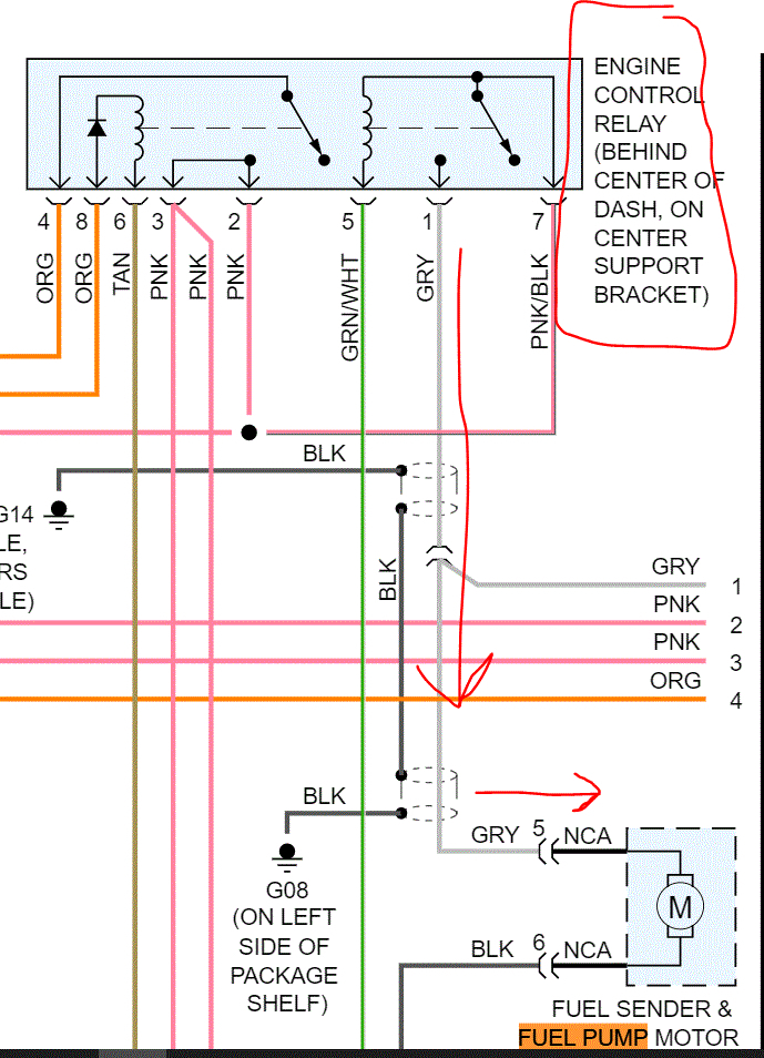 First, I attached a pic of the relay that powers the fuel pump. It is referred to as the Engine Control Relay. See pic 1. It shows location.
