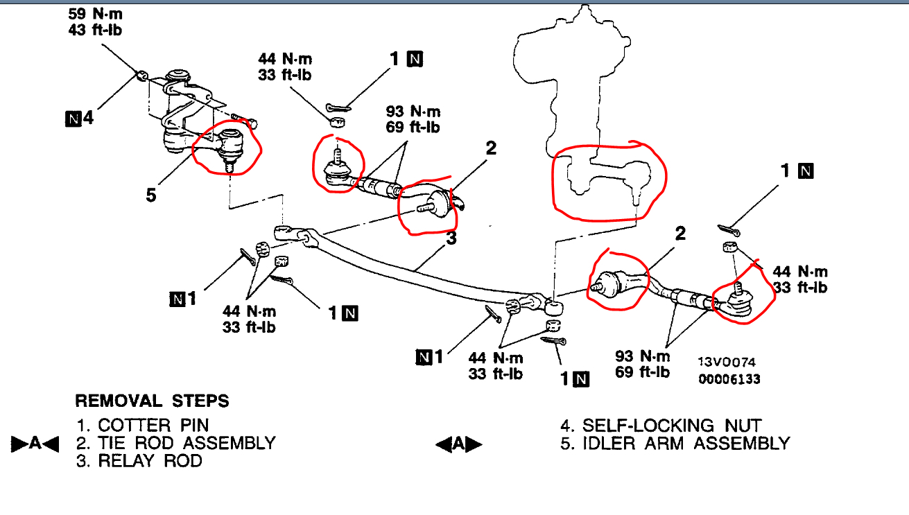 If you lift the front wheels, place your hands a 3 and 6 o'clock and find play, most likely you have a bad tie rod. Have a helper watch for where the play is coming from as you move the wheel back and forth. I attached a pic below and circled all components which can cause this. There are tie rods, an idler arm, pitman arm, and center link. See pic 1 and check all of those areas for play. Also, place your hands at 6 and 12 o'clock and check for play in the ball joints. These joints connect the control arm to the steering knuckle. If you look at pics 2 and 3, they show the part in an exploded view. Pic 2 is the upper and pic 3 is the lower ball joint.