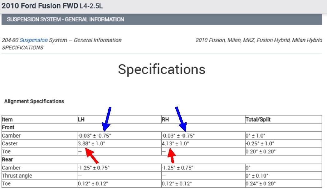 The first image below shows the alignment specs for your model. Front camber is shown as -0.03 degrees, which, for all practical purposes, is perfectly straight up and down. That value is very respectable, but it's the tolerance of 0.75 degrees that is a heart breaker, (blue arrows).