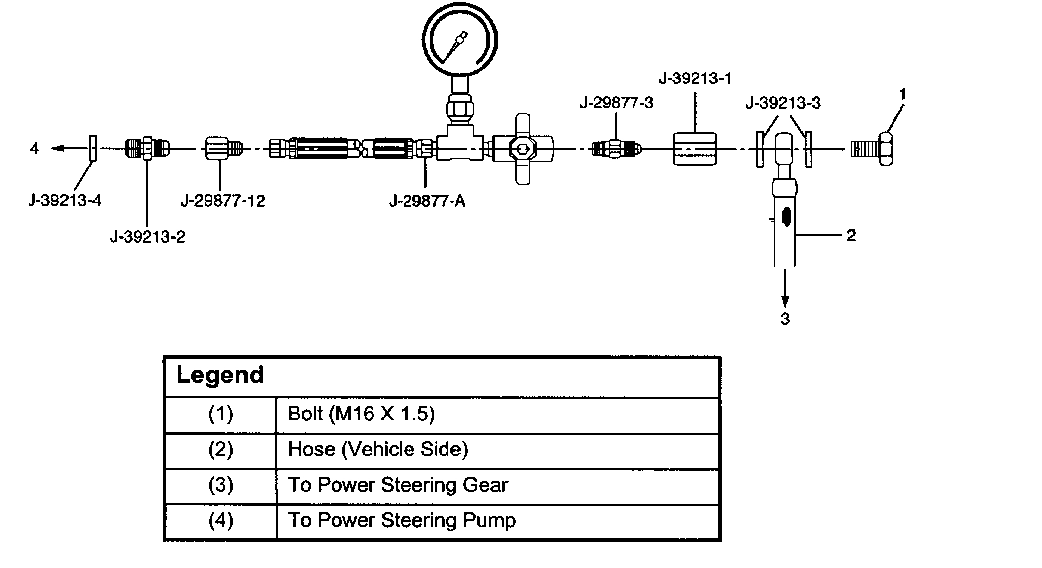 2. With the engine NOT running, disconnect the pressure hose at the power steering pump and install power steering tester J-29877-A. The gauge must be between the shutoff valve and pump. Open the shutoff valve.