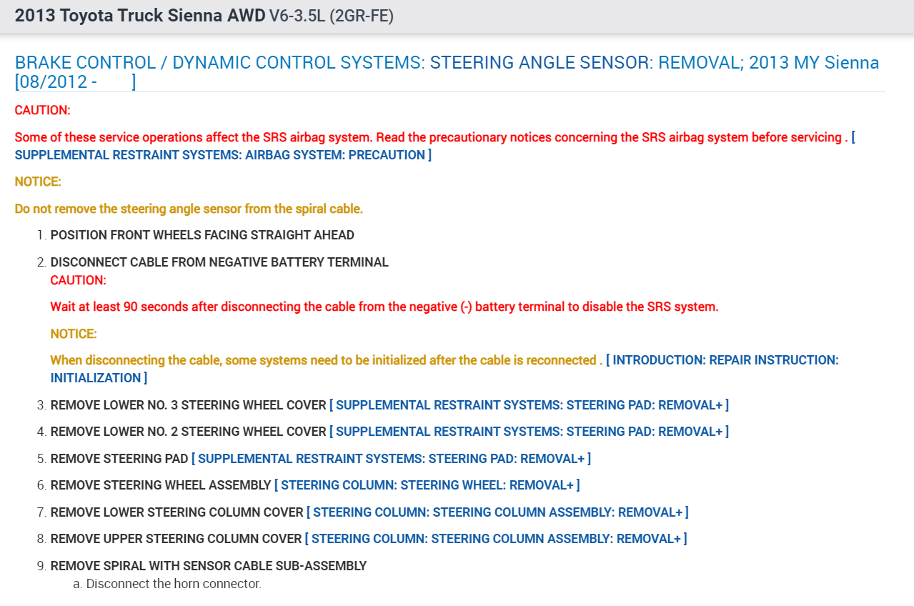 Here is how to replace the steering wheel angle sensor in the instructions below. You could have a bad sensor it is was not installed correctly. There is also a fuse that runs the system I would check ECU-IG 1 in the interior fuse panel on the left side of the dash. Here are the wiring diagrams for the sensor as well so you can see how the system works. Check out the images (below). Let us know what happens and please upload pictures or videos of the problem so we can see what's going on.
