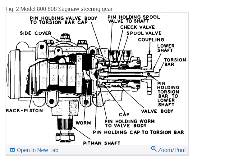 Sounds like fun! It sounds like the sector shaft valve int he steering box is not working correctly. There are two types of Saginaw integral rotary valve type single piston steering gears. The two different types of gears can be identified by the configuration of the side covers. The Model 605 gear has a round side cover, secured with a retaining ring. The Model 800-808 gear has a rectangular side cover, secured with four bolts. Also, note that the Model 800-808 gear incorporates balls in the rack piston, while the Model 605 gear does not.