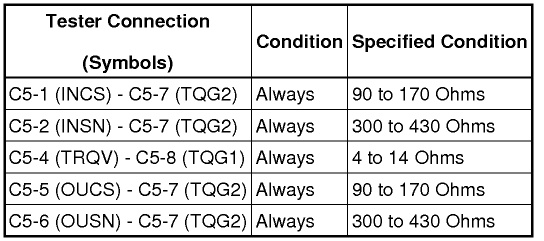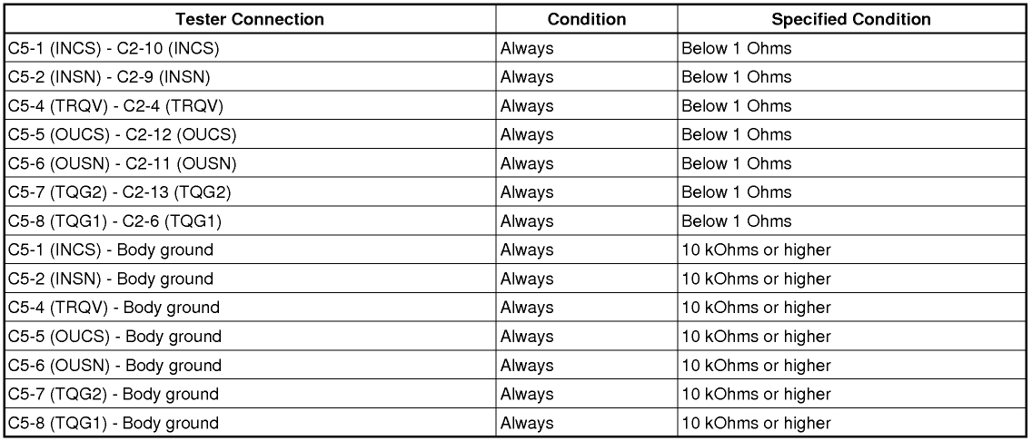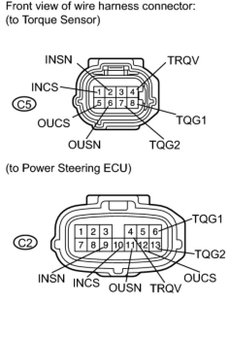 The first set of images show the two connections for the power steering sensor to the power steering ECU. Connector 2 and connector 5. Test between the points indicated in the chart and verify those values. (basic continuity)
