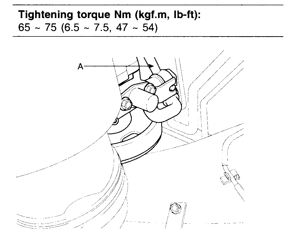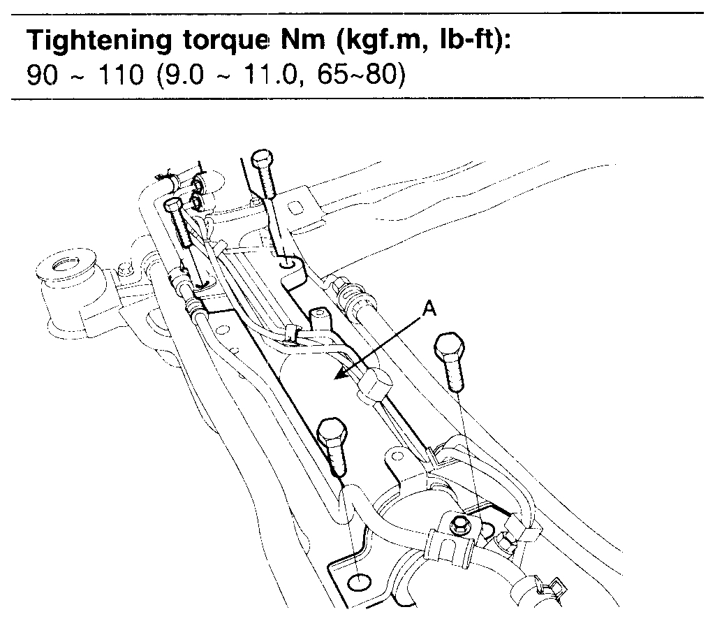 14. Remove the power steering gear box (A) from the sub-frame by loosening the mounting bolts.