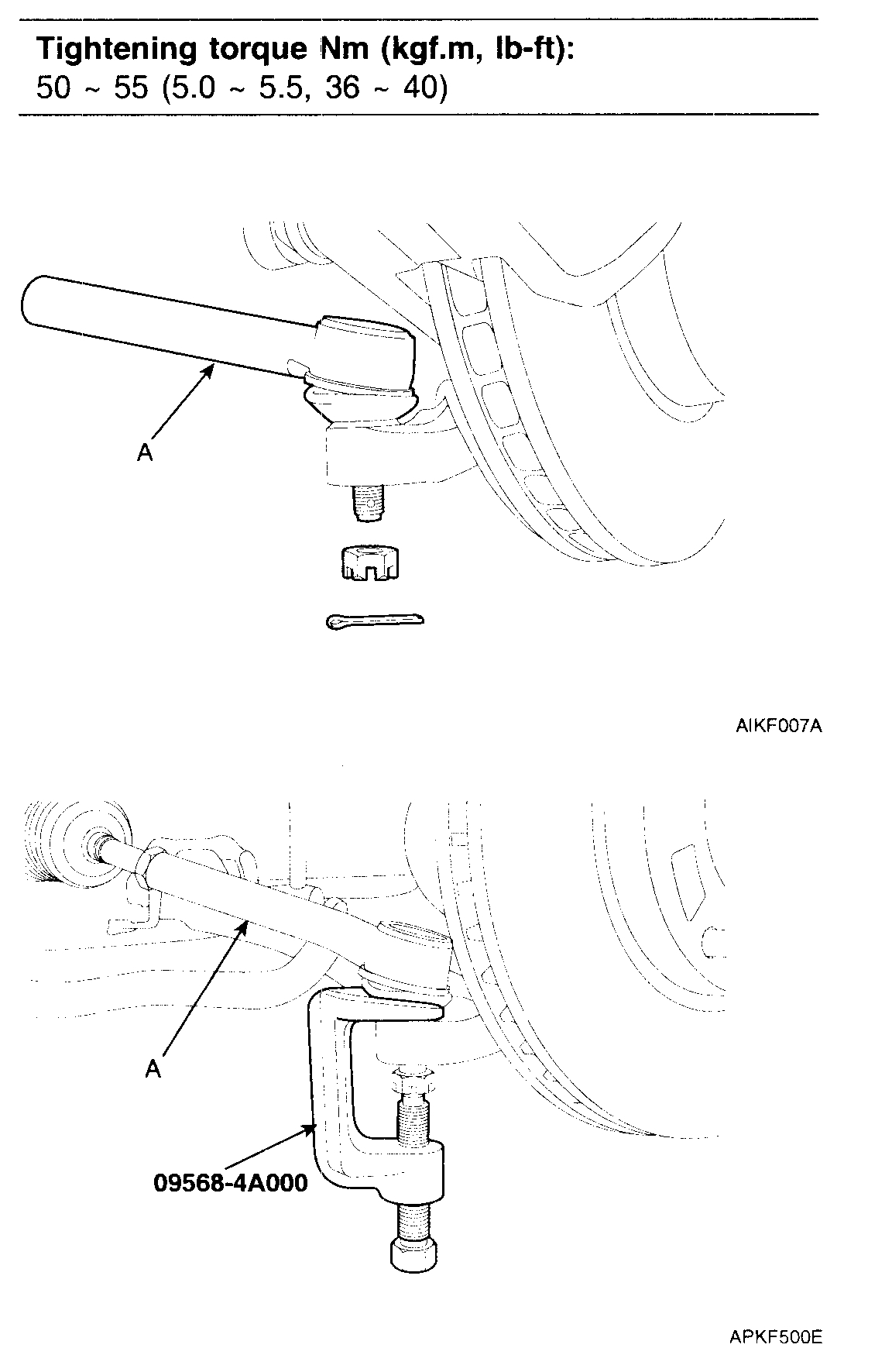 6. Loosen the split pin and castle nut, and then remove the tie rod end (A) from the knuckle by using a SST (09568-4A000).