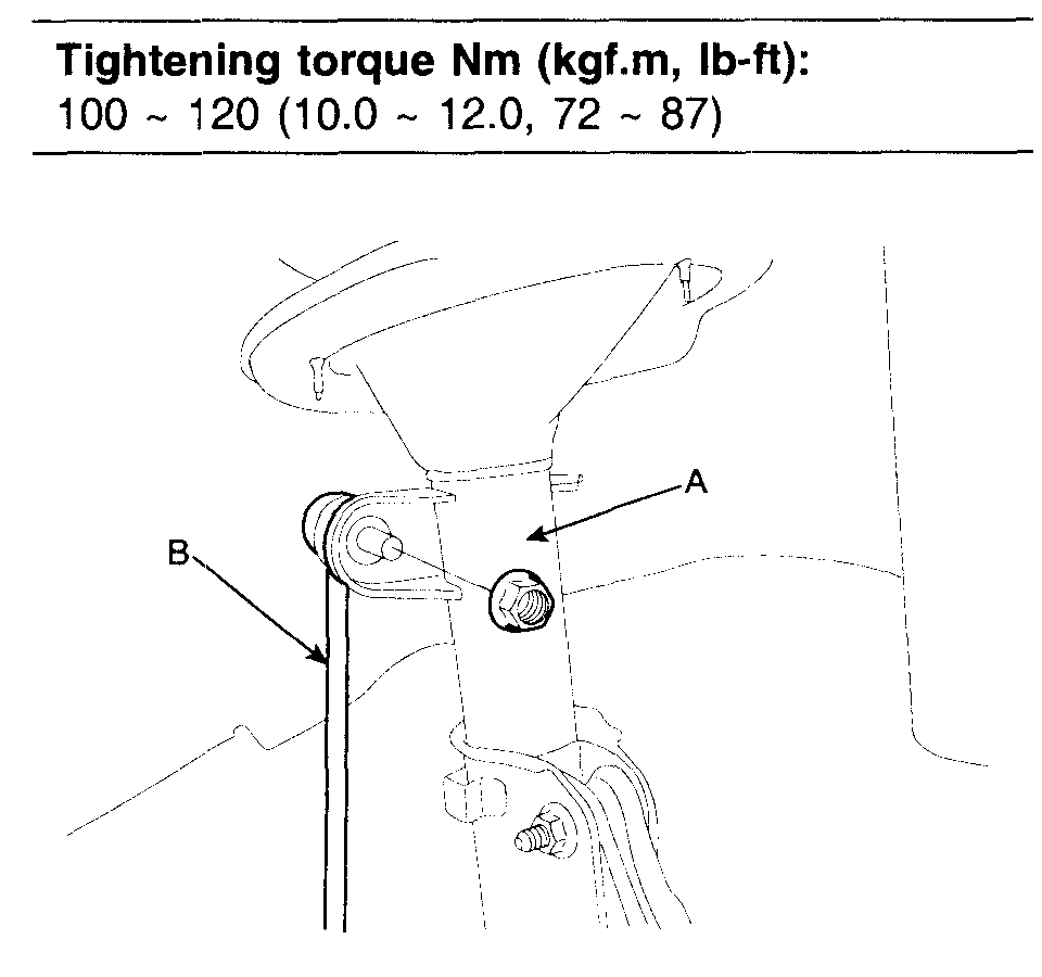 8. Disconnect the stabilizer link (B) from the strut assembly (A) by loosening nut.