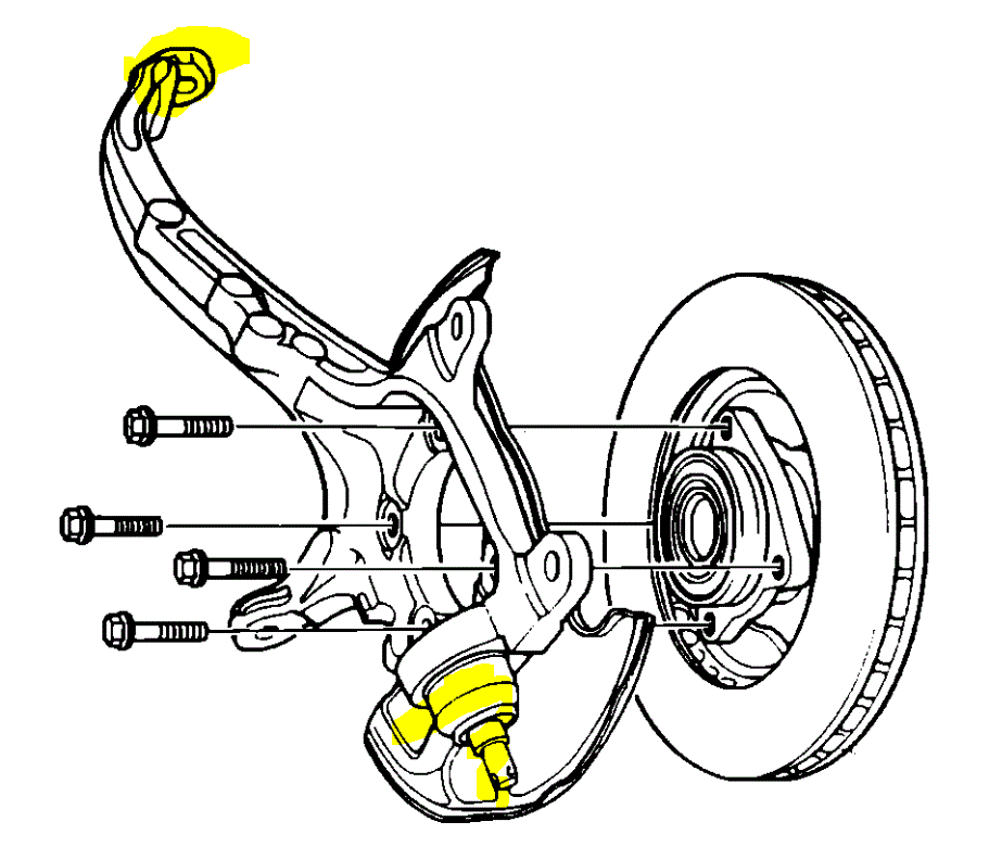 Next, place your hands at 6 and 12 o'clock. See if there is play in the ball joints. There is both an upper and lower ball joint. In pic 2, I highlighted their locations.